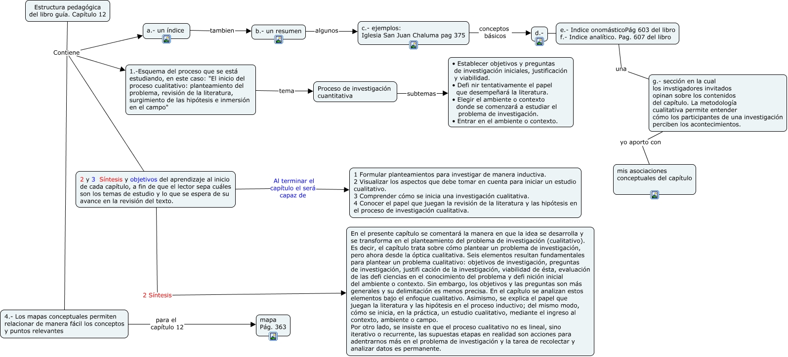 Este Cmap, tiene información relacionada con: Estructura pedagógica del capítulo 12, Proceso de investigación cuantitativa subtemas • Establecer objetivos y preguntas de investigación iniciales, justificación y viabilidad. • Defi nir tentativamente el papel que desempeñará la literatura. • Elegir el ambiente o contexto donde se comenzará a estudiar el problema de investigación. • Entrar en el ambiente o contexto., c.- ejemplos: Iglesia San Juan Chaluma pag 375 conceptos básicos d.-, 2 y 3 Síntesis y objetivos del aprendizaje al inicio de cada capítulo, a fin de que el lector sepa cuáles son los temas de estudio y lo que se espera de su avance en la revisión del texto. Al terminar el capítulo el será capaz de 1 Formular planteamientos para investigar de manera inductiva. 2 Visualizar los aspectos que debe tomar en cuenta para iniciar un estudio cualitativo. 3 Comprender cómo se inicia una investigación cualitativa. 4 Conocer el papel que juegan la revisión de la literatura y las hipótesis en el proceso de investigación cualitativa., b.- un resumen algunos c.- ejemplos: Iglesia San Juan Chaluma pag 375, Estructura pedagógica del libro guía. Capítulo 12 Contiene 4.- Los mapas conceptuales permiten relacionar de manera fácil los conceptos y puntos relevantes, Estructura pedagógica del libro guía. Capítulo 12 Contiene 1.-Esquema del proceso que se está estudiando, en este caso: "El inicio del proceso cualitativo: planteamiento del problema, revisión de la literatura, surgimiento de las hipótesis e inmersión en el campo", a.- un índice tambien b.- un resumen, Estructura pedagógica del libro guía. Capítulo 12 Contiene 2 y 3 Síntesis y objetivos del aprendizaje al inicio de cada capítulo, a fin de que el lector sepa cuáles son los temas de estudio y lo que se espera de su avance en la revisión del texto., 1.-Esquema del proceso que se está estudiando, en este caso: "El inicio del proceso cualitativo: planteamiento del problema, revisión de la literatura, surgimiento de las hipótesis e inmersión en el campo" tema Proceso de investigación cuantitativa, g.- sección en la cual los invstigadores invitados opinan sobre los contenidos del capítulo. La metodología cualitativa permite entender cómo los participantes de una investigación perciben los acontecimientos. yo aporto con mis asociaciones conceptuales del capítulo, d.- un e.- Indice onomásticoPág 603 del libro f.- Indice analítico. Pag. 607 del libro, 4.- Los mapas conceptuales permiten relacionar de manera fácil los conceptos y puntos relevantes para el capítulo 12 mapa Pág. 363, Estructura pedagógica del libro guía. Capítulo 12 Contiene a.- un índice, 2 y 3 Síntesis y objetivos del aprendizaje al inicio de cada capítulo, a fin de que el lector sepa cuáles son los temas de estudio y lo que se espera de su avance en la revisión del texto. 2 Síntesis En el presente capítulo se comentará la manera en que la idea se desarrolla y se transforma en el planteamiento del problema de investigación (cualitativo). Es decir, el capítulo trata sobre cómo plantear un problema de investigación, pero ahora desde la óptica cualitativa. Seis elementos resultan fundamentales para plantear un problema cualitativo: objetivos de investigación, preguntas de investigación, justifi cación de la investigación, viabilidad de ésta, evaluación de las defi ciencias en el conocimiento del problema y defi nición inicial del ambiente o contexto. Sin embargo, los objetivos y las preguntas son más generales y su delimitación es menos precisa. En el capítulo se analizan estos elementos bajo el enfoque cualitativo. Asimismo, se explica el papel que juegan la literatura y las hipótesis en el proceso inductivo; del mismo modo, cómo se inicia, en la práctica, un estudio cualitativo, mediante el ingreso al contexto, ambiente o campo. Por otro lado, se insiste en que el proceso cualitativo no es lineal, sino iterativo o recurrente, las supuestas etapas en realidad son acciones para adentrarnos más en el problema de investigación y la tarea de recolectar y analizar datos es permanente., e.- Indice onomásticoPág 603 del libro f.- Indice analítico. Pag. 607 del libro una g.- sección en la cual los invstigadores invitados opinan sobre los contenidos del capítulo. La metodología cualitativa permite entender cómo los participantes de una investigación perciben los acontecimientos.