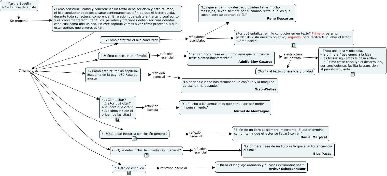 Este Cmap, tiene información relacionada con: La fase de ajuste, "Escribir. Toda frase es un problema que la próxima frase plantea nuevamente." Adolfo Bioy Casares la estructura del párrafo Otorga al texto coherencia y unidad, ¿Cómo construir unidad y coherencia? Un texto debe ser claro y estructurado, el hilo conductor debe destacarse continuamente, a fin de que el lector pueda, durante toda su lectura, comprender lá relación que existe entre tal o cual punto y el problema tratado. Capítulos, párrafos y oraciones deben ser considerados cada cual como una unidad. En esté capítulo vamos a ver cómo proceder, a qué estar atento, qué errores evitar. 7 numerales 4. ¿Cómo citar? 4.1 ¿Por qué citar? 4.2 ¿para que citar? 4.3 ¿cómo indicar el origen de las citas?, ¿Cómo construir unidad y coherencia? Un texto debe ser claro y estructurado, el hilo conductor debe destacarse continuamente, a fin de que el lector pueda, durante toda su lectura, comprender lá relación que existe entre tal o cual punto y el problema tratado. Capítulos, párrafos y oraciones deben ser considerados cada cual como una unidad. En esté capítulo vamos a ver cómo proceder, a qué estar atento, qué errores evitar. 7 numerales 2 ¿Cómo construir un párrafo?, Martha Boeglin N° 4 La fase de ajuste Se propone ¿Cómo construir unidad y coherencia? Un texto debe ser claro y estructurado, el hilo conductor debe destacarse continuamente, a fin de que el lector pueda, durante toda su lectura, comprender lá relación que existe entre tal o cual punto y el problema tratado. Capítulos, párrafos y oraciones deben ser considerados cada cual como una unidad. En esté capítulo vamos a ver cómo proceder, a qué estar atento, qué errores evitar., 7. Lista de chequeo reflexión esencial "Utiliza el lenguaje ordinario y di cosas extraordinarias." Arthur Schopenhauer, ¿Cómo construir unidad y coherencia? Un texto debe ser claro y estructurado, el hilo conductor debe destacarse continuamente, a fin de que el lector pueda, durante toda su lectura, comprender lá relación que existe entre tal o cual punto y el problema tratado. Capítulos, párrafos y oraciones deben ser considerados cada cual como una unidad. En esté capítulo vamos a ver cómo proceder, a qué estar atento, qué errores evitar. 7 numerales 7. Lista de chequeo, 4. ¿Cómo citar? 4.1 ¿Por qué citar? 4.2 ¿para que citar? 4.3 ¿cómo indicar el origen de las citas? reflexión esencia "Yo no cito a los demás mas que para expresar mejor mi pensamiento." Michel de Montaigne, ¿Cómo construir unidad y coherencia? Un texto debe ser claro y estructurado, el hilo conductor debe destacarse continuamente, a fin de que el lector pueda, durante toda su lectura, comprender lá relación que existe entre tal o cual punto y el problema tratado. Capítulos, párrafos y oraciones deben ser considerados cada cual como una unidad. En esté capítulo vamos a ver cómo proceder, a qué estar atento, qué errores evitar. 7 numerales 6. ¿Qué debe incluir la introducción general?, 6. ¿Qué debe incluir la introducción general? reflexión esencial "La primera frase de un libro es la que el autor encuentra al final." Blas Pascal, 3 ¿Cómo estructurar un capítulo? Esquema en la pág. 189 Fase de ajuste reflexión esencial "Lo peor es cuando has terminado un capítulo y la máquina de escribir no aplaude." OrsonWelles, "Escribir. Toda frase es un problema que la próxima frase plantea nuevamente." Adolfo Bioy Casares la estructura del párrafo - Trata una idea y una sola, - la primera frase enuncia la idea, - las frases siguientes la desarrollan, - la última frase concluye el desarrollo y, por consiguiente, facilita la transición al párrafo siguiente., ¿Cómo construir unidad y coherencia? Un texto debe ser claro y estructurado, el hilo conductor debe destacarse continuamente, a fin de que el lector pueda, durante toda su lectura, comprender lá relación que existe entre tal o cual punto y el problema tratado. Capítulos, párrafos y oraciones deben ser considerados cada cual como una unidad. En esté capítulo vamos a ver cómo proceder, a qué estar atento, qué errores evitar. 7 numerales 5. ¿Qué debe incluir la conclusión general?, 1. ¿Cómo enfatizar el hilo conductor reflexiones esenciales ¿Por qué enfatizar el hilo conductor en un texto? Primero, para no perder de vista nuestro objetivo; segundo, para facilitarle la labor al lector. ¿Cómo hacer?, ¿Cómo construir unidad y coherencia? Un texto debe ser claro y estructurado, el hilo conductor debe destacarse continuamente, a fin de que el lector pueda, durante toda su lectura, comprender lá relación que existe entre tal o cual punto y el problema tratado. Capítulos, párrafos y oraciones deben ser considerados cada cual como una unidad. En esté capítulo vamos a ver cómo proceder, a qué estar atento, qué errores evitar. 7 numerales 3 ¿Cómo estructurar un capítulo? Esquema en la pág. 189 Fase de ajuste, ¿Cómo construir unidad y coherencia? Un texto debe ser claro y estructurado, el hilo conductor debe destacarse continuamente, a fin de que el lector pueda, durante toda su lectura, comprender lá relación que existe entre tal o cual punto y el problema tratado. Capítulos, párrafos y oraciones deben ser considerados cada cual como una unidad. En esté capítulo vamos a ver cómo proceder, a qué estar atento, qué errores evitar. 7 numerales 1. ¿Cómo enfatizar el hilo conductor, 2 ¿Cómo construir un párrafo? reflexión esencial "Escribir. Toda frase es un problema que la próxima frase plantea nuevamente." Adolfo Bioy Casares, 5. ¿Qué debe incluir la conclusión general? reflexión esencial "El fin de un libro es siempre importante. El autor termina con un tema que el lector se llevará con él." Daniel Marjerat, 1. ¿Cómo enfatizar el hilo conductor reflexiones esenciales "Los que andan muy despacio pueden llegar mucho más lejos, si van siempre por el camino recto,