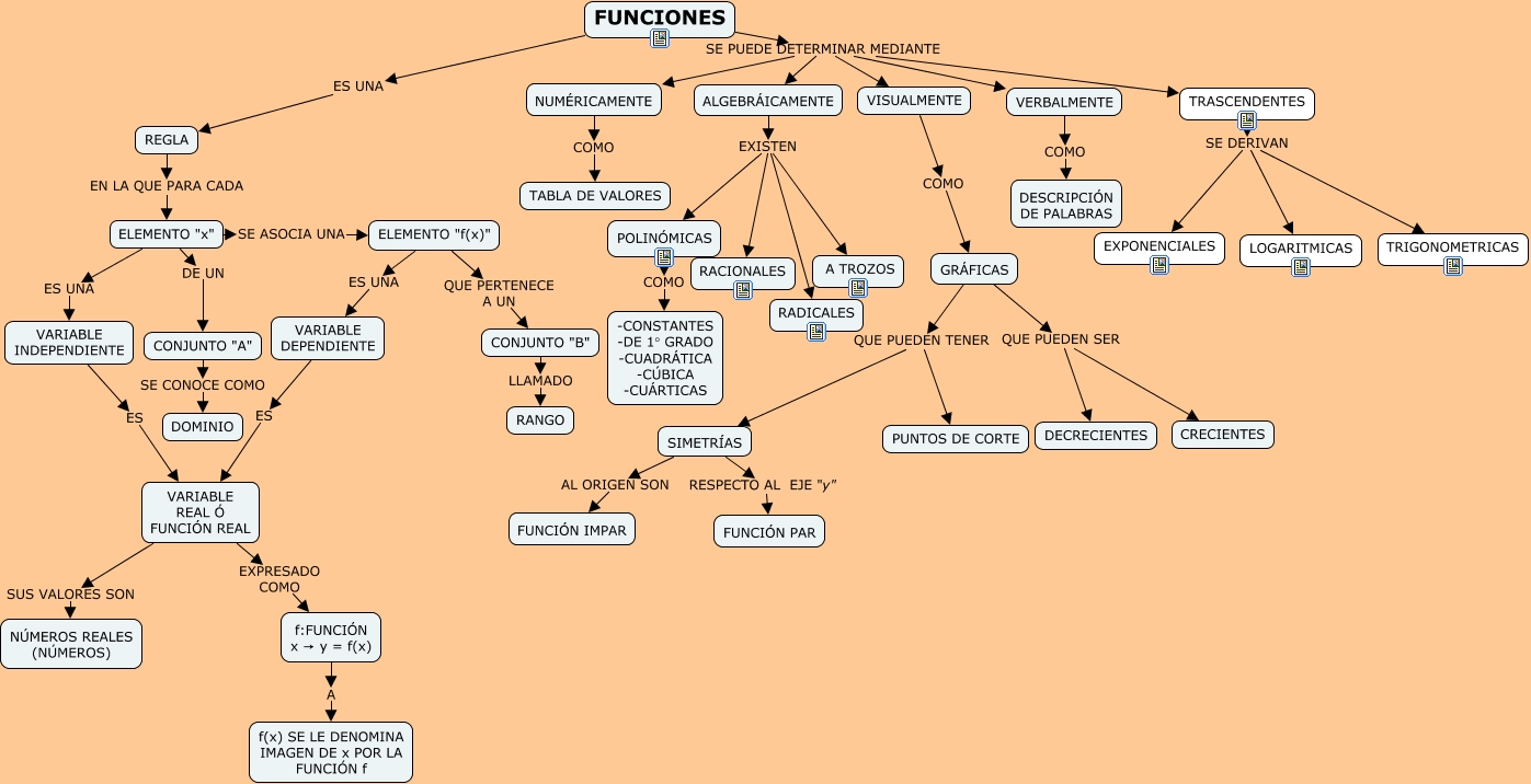Este Cmap, tiene información relacionada con: MAPA CONCEPTUAL FUNCIONES, CONJUNTO "A" SE CONOCE COMO DOMINIO, TRASCENDENTES SE DERIVAN TRIGONOMETRICAS, TRASCENDENTES SE DERIVAN EXPONENCIALES, SIMETRÍAS RESPECTO AL EJE "y" FUNCIÓN PAR, CONJUNTO "B" LLAMADO RANGO, f:FUNCIÓN x → y = f(x) A f(x) SE LE DENOMINA IMAGEN DE x POR LA FUNCIÓN f, ALGEBRÁICAMENTE EXISTEN RADICALES, ALGEBRÁICAMENTE EXISTEN A TROZOS, VARIABLE REAL Ó FUNCIÓN REAL SUS VALORES SON NÚMEROS REALES (NÚMEROS), FUNCIONES SE PUEDE DETERMINAR MEDIANTE VISUALMENTE, TRASCENDENTES SE DERIVAN LOGARITMICAS, SIMETRÍAS AL ORIGEN SON FUNCIÓN IMPAR, FUNCIONES SE PUEDE DETERMINAR MEDIANTE VERBALMENTE, ELEMENTO "x" SE ASOCIA UNA ELEMENTO "f(x)", POLINÓMICAS COMO -CONSTANTES -DE 1° GRADO -CUADRÁTICA -CÚBICA -CUÁRTICAS, ALGEBRÁICAMENTE EXISTEN RACIONALES, FUNCIONES SE PUEDE DETERMINAR MEDIANTE NUMÉRICAMENTE, ELEMENTO "f(x)" QUE PERTENECE A UN CONJUNTO "B", VARIABLE INDEPENDIENTE ES VARIABLE REAL Ó FUNCIÓN REAL, VERBALMENTE COMO DESCRIPCIÓN DE PALABRAS