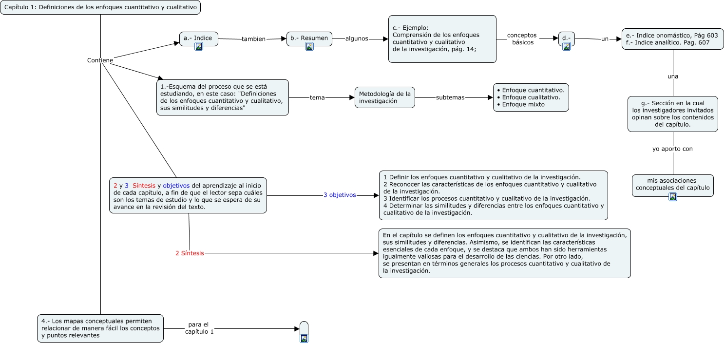 Este Cmap, tiene información relacionada con: CAPITULO 1, Metodología de la investigación subtemas • Enfoque cuantitativo. • Enfoque cualitativo. • Enfoque mixto, c.- Ejemplo: Comprensión de los enfoques cuantitativo y cualitativo de la investigación, pág. 14; conceptos básicos d.-, 2 y 3 Síntesis y objetivos del aprendizaje al inicio de cada capítulo, a fin de que el lector sepa cuáles son los temas de estudio y lo que se espera de su avance en la revisión del texto. 3 objetivos 1 Definir los enfoques cuantitativo y cualitativo de la investigación. 2 Reconocer las características de los enfoques cuantitativo y cualitativo de la investigación. 3 Identificar los procesos cuantitativo y cualitativo de la investigación. 4 Determinar las similitudes y diferencias entre los enfoques cuantitativo y cualitativo de la investigación., b.- Resumen algunos c.- Ejemplo: Comprensión de los enfoques cuantitativo y cualitativo de la investigación, pág. 14;, Capítulo 1: Definiciones de los enfoques cuantitativo y cualitativo Contiene 4.- Los mapas conceptuales permiten relacionar de manera fácil los conceptos y puntos relevantes, Capítulo 1: Definiciones de los enfoques cuantitativo y cualitativo Contiene 1.-Esquema del proceso que se está estudiando, en este caso: "Definiciones de los enfoques cuantitativo y cualitativo, sus similitudes y diferencias", a.- Indice tambien b.- Resumen, Capítulo 1: Definiciones de los enfoques cuantitativo y cualitativo Contiene 2 y 3 Síntesis y objetivos del aprendizaje al inicio de cada capítulo, a fin de que el lector sepa cuáles son los temas de estudio y lo que se espera de su avance en la revisión del texto., 1.-Esquema del proceso que se está estudiando, en este caso: "Definiciones de los enfoques cuantitativo y cualitativo, sus similitudes y diferencias" tema Metodología de la investigación, g.- Sección en la cual los investigadores invitados opinan sobre los contenidos del capítulo. yo aporto con mis asociaciones conceptuales del capítulo, d.- un e.- Indice onomástico, Pág 603 f.- Indice analítico. Pag. 607, 4.- Los mapas conceptuales permiten relacionar de manera fácil los conceptos y puntos relevantes para el capítulo 1, Capítulo 1: Definiciones de los enfoques cuantitativo y cualitativo Contiene a.- Indice, 2 y 3 Síntesis y objetivos del aprendizaje al inicio de cada capítulo, a fin de que el lector sepa cuáles son los temas de estudio y lo que se espera de su avance en la revisión del texto. 2 Síntesis En el capítulo se definen los enfoques cuantitativo y cualitativo de la investigación, sus similitudes y diferencias. Asimismo, se identifican las características esenciales de cada enfoque, y se destaca que ambos han sido herramientas igualmente valiosas para el desarrollo de las ciencias. Por otro lado, se presentan en términos generales los procesos cuantitativo y cualitativo de la investigación., e.- Indice onomástico, Pág 603 f.- Indice analítico. Pag. 607 una g.- Sección en la cual los investigadores invitados opinan sobre los contenidos del capítulo.