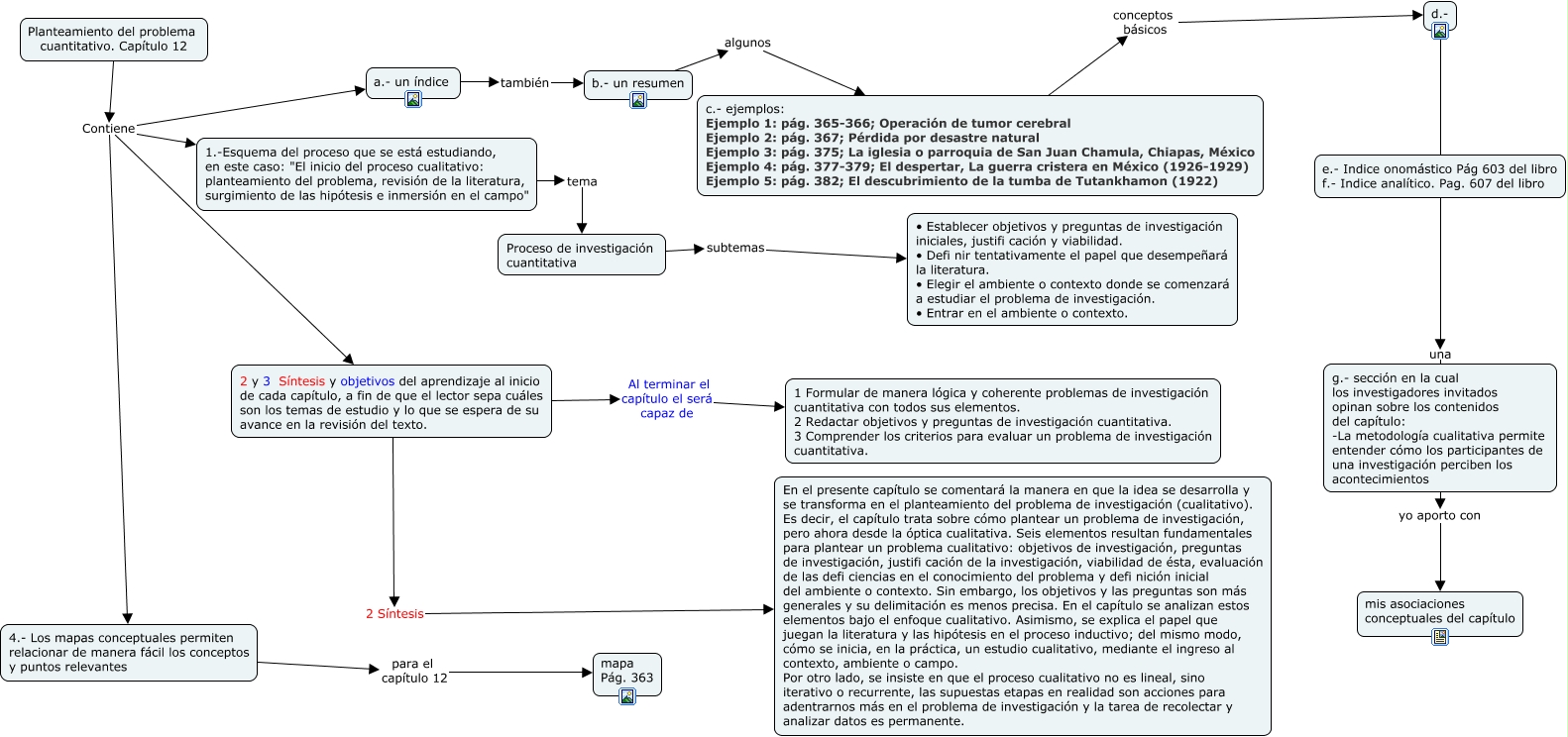 Este Cmap, tiene información relacionada con: CAPITULO 12, Proceso de investigación cuantitativa subtemas • Establecer objetivos y preguntas de investigación iniciales, justifi cación y viabilidad. • Defi nir tentativamente el papel que desempeñará la literatura. • Elegir el ambiente o contexto donde se comenzará a estudiar el problema de investigación. • Entrar en el ambiente o contexto., c.- ejemplos: Ejemplo 1: pág. 365-366; Operación de tumor cerebral Ejemplo 2: pág. 367; Pérdida por desastre natural Ejemplo 3: pág. 375; La iglesia o parroquia de San Juan Chamula, Chiapas, México Ejemplo 4: pág. 377-379; El despertar, La guerra cristera en México (1926-1929) Ejemplo 5: pág. 382; El descubrimiento de la tumba de Tutankhamon (1922) conceptos básicos d.-, 2 y 3 Síntesis y objetivos del aprendizaje al inicio de cada capítulo, a fin de que el lector sepa cuáles son los temas de estudio y lo que se espera de su avance en la revisión del texto. Al terminar el capítulo el será capaz de 1 Formular de manera lógica y coherente problemas de investigación cuantitativa con todos sus elementos. 2 Redactar objetivos y preguntas de investigación cuantitativa. 3 Comprender los criterios para evaluar un problema de investigación cuantitativa., b.- un resumen algunos c.- ejemplos: Ejemplo 1: pág. 365-366; Operación de tumor cerebral Ejemplo 2: pág. 367; Pérdida por desastre natural Ejemplo 3: pág. 375; La iglesia o parroquia de San Juan Chamula, Chiapas, México Ejemplo 4: pág. 377-379; El despertar, La guerra cristera en México (1926-1929) Ejemplo 5: pág. 382; El descubrimiento de la tumba de Tutankhamon (1922), Planteamiento del problema cuantitativo. Capítulo 12 Contiene 4.- Los mapas conceptuales permiten relacionar de manera fácil los conceptos y puntos relevantes, Planteamiento del problema cuantitativo. Capítulo 12 Contiene 1.-Esquema del proceso que se está estudiando, en este caso: "El inicio del proceso cualitativo: planteamiento del problema, revisión de la literatura, surgimiento de las hipótesis e inmersión en el campo", a.- un índice también b.- un resumen, Planteamiento del problema cuantitativo. Capítulo 12 Contiene 2 y 3 Síntesis y objetivos del aprendizaje al inicio de cada capítulo, a fin de que el lector sepa cuáles son los temas de estudio y lo que se espera de su avance en la revisión del texto., 1.-Esquema del proceso que se está estudiando, en este caso: "El inicio del proceso cualitativo: planteamiento del problema, revisión de la literatura, surgimiento de las hipótesis e inmersión en el campo" tema Proceso de investigación cuantitativa, g.- sección en la cual los investigadores invitados opinan sobre los contenidos del capítulo: -La metodología cualitativa permite entender cómo los participantes de una investigación perciben los acontecimientos yo aporto con mis asociaciones conceptuales del capítulo, d.- un e.- Indice onomástico Pág 603 del libro f.- Indice analítico. Pag. 607 del libro, 4.- Los mapas conceptuales permiten relacionar de manera fácil los conceptos y puntos relevantes para el capítulo 12 mapa Pág. 363, Planteamiento del problema cuantitativo. Capítulo 12 Contiene a.- un índice, 2 y 3 Síntesis y objetivos del aprendizaje al inicio de cada capítulo, a fin de que el lector sepa cuáles son los temas de estudio y lo que se espera de su avance en la revisión del texto. 2 Síntesis En el presente capítulo se comentará la manera en que la idea se desarrolla y se transforma en el planteamiento del problema de investigación (cualitativo). Es decir, el capítulo trata sobre cómo plantear un problema de investigación, pero ahora desde la óptica cualitativa. Seis elementos resultan fundamentales para plantear un problema cualitativo: objetivos de investigación, preguntas de investigación, justifi cación de la investigación, viabilidad de ésta, evaluación de las defi ciencias en el conocimiento del problema y defi nición inicial del ambiente o contexto. Sin embargo, los objetivos y las preguntas son más generales y su delimitación es menos precisa. En el capítulo se analizan estos elementos bajo el enfoque cualitativo. Asimismo, se explica el papel que juegan la literatura y las hipótesis en el proceso inductivo; del mismo modo, cómo se inicia, en la práctica, un estudio cualitativo, mediante el ingreso al contexto, ambiente o campo. Por otro lado, se insiste en que el proceso cualitativo no es lineal, sino iterativo o recurrente, las supuestas etapas en realidad son acciones para adentrarnos más en el problema de investigación y la tarea de recolectar y analizar datos es permanente., e.- Indice onomástico Pág 603 del libro f.- Indice analítico. Pag. 607 del libro una g.- sección en la cual los investigadores invitados opinan sobre los contenidos del capítulo: -La metodología cualitativa permite entender cómo los participantes de una investigación perciben los acontecimientos
