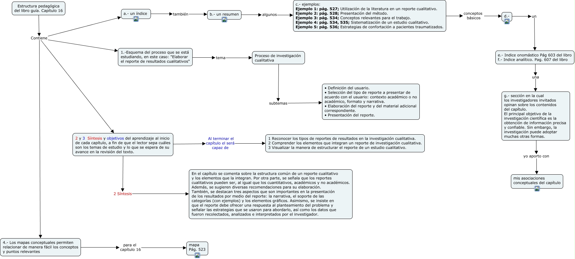 Este Cmap, tiene información relacionada con: Estructura pedag+¦gica del cap+¡tulo 16, Proceso de investigación cualitativa subtemas • Definición del usuario. • Selección del tipo de reporte a presentar de acuerdo con el usuario: contexto académico o no académico, formato y narrativa. • Elaboración del reporte y del material adicional correspondiente. • Presentación del reporte., c.- ejemplos: Ejemplo 1: pág. 527; Utilización de la literatura en un reporte cualitativo. Ejemplo 2: pág. 528; Presentación del método. Ejemplo 3: pág. 534; Conceptos relevantes para el trabajo. Ejemplo 4: pág. 534, 535; Sistematización de un estudio cualitativo. Ejemplo 5: pág. 536; Estrategias de confortación a pacientes traumatizados. conceptos básicos d.-, 2 y 3 Síntesis y objetivos del aprendizaje al inicio de cada capítulo, a fin de que el lector sepa cuáles son los temas de estudio y lo que se espera de su avance en la revisión del texto. Al terminar el capítulo el será capaz de 1 Reconocer los tipos de reportes de resultados en la investigación cualitativa. 2 Comprender los elementos que integran un reporte de investigación cualitativa. 3 Visualizar la manera de estructurar el reporte de un estudio cualitativo., b.- un resumen algunos c.- ejemplos: Ejemplo 1: pág. 527; Utilización de la literatura en un reporte cualitativo. Ejemplo 2: pág. 528; Presentación del método. Ejemplo 3: pág. 534; Conceptos relevantes para el trabajo. Ejemplo 4: pág. 534, 535; Sistematización de un estudio cualitativo. Ejemplo 5: pág. 536; Estrategias de confortación a pacientes traumatizados., Estructura pedagógica del libro guía. Capítulo 16 Contiene 4.- Los mapas conceptuales permiten relacionar de manera fácil los conceptos y puntos relevantes, Estructura pedagógica del libro guía. Capítulo 16 Contiene 1.-Esquema del proceso que se está estudiando, en este caso: "Elaborar el reporte de resultados cualitativos", a.- un índice también b.- un resumen, Estructura pedagógica del libro guía. Capítulo 16 Contiene 2 y 3 Síntesis y objetivos del aprendizaje al inicio de cada capítulo, a fin de que el lector sepa cuáles son los temas de estudio y lo que se espera de su avance en la revisión del texto., 1.-Esquema del proceso que se está estudiando, en este caso: "Elaborar el reporte de resultados cualitativos" tema Proceso de investigación cualitativa, g.- sección en la cual los investigadores invitados opinan sobre los contenidos del capítulo. El principal objetivo de la investigación científica es la obtención de información precisa y confiable. Sin embargo, la investigación puede adoptar muchas otras formas. yo aporto con mis asociaciones conceptuales del capítulo, d.- un e.- Indice onomástico Pág 603 del libro f.- Indice analítico. Pag. 607 del libro, 4.- Los mapas conceptuales permiten relacionar de manera fácil los conceptos y puntos relevantes para el capítulo 16 mapa Pág. 523, Estructura pedagógica del libro guía. Capítulo 16 Contiene a.- un índice, 2 y 3 Síntesis y objetivos del aprendizaje al inicio de cada capítulo, a fin de que el lector sepa cuáles son los temas de estudio y lo que se espera de su avance en la revisión del texto. 2 Síntesis En el capítulo se comenta sobre la estructura común de un reporte cualitativo y los elementos que la integran. Por otra parte, se señala que los reportes cualitativos pueden ser, al igual que los cuantitativos, académicos y no académicos. Además, se sugieren diversas recomendaciones para su elaboración. También, se destacan tres aspectos que son importantes en la presentación de los resultados por medio del reporte: la narrativa, el soporte de las categorías (con ejemplos) y los elementos gráficos. Asimismo, se insiste en que el reporte debe ofrecer una respuesta al planteamiento del problema y señalar las estrategias que se usaron para abordarlo, así como los datos que fueron recolectados, analizados e interpretados por el investigador., e.- Indice onomástico Pág 603 del libro f.- Indice analítico. Pag. 607 del libro una g.- sección en la cual los investigadores invitados opinan sobre los contenidos del capítulo. El principal objetivo de la investigación científica es la obtención de información precisa y confiable. Sin embargo, la investigación puede adoptar muchas otras formas.