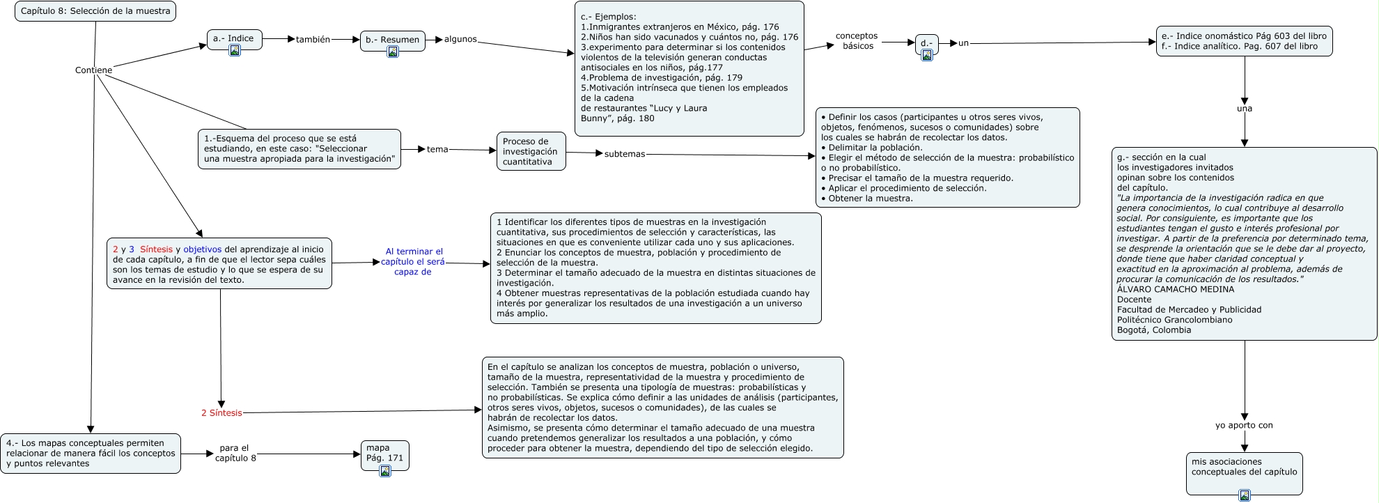 Este Cmap, tiene información relacionada con: CAPITULO 8, 2 y 3 Síntesis y objetivos del aprendizaje al inicio de cada capítulo, a fin de que el lector sepa cuáles son los temas de estudio y lo que se espera de su avance en la revisión del texto. Al terminar el capítulo el será capaz de 1 Identificar los diferentes tipos de muestras en la investigación cuantitativa, sus procedimientos de selección y características, las situaciones en que es conveniente utilizar cada uno y sus aplicaciones. 2 Enunciar los conceptos de muestra, población y procedimiento de selección de la muestra. 3 Determinar el tamaño adecuado de la muestra en distintas situaciones de investigación. 4 Obtener muestras representativas de la población estudiada cuando hay interés por generalizar los resultados de una investigación a un universo más amplio., g.- sección en la cual los investigadores invitados opinan sobre los contenidos del capítulo. "La importancia de la investigación radica en que genera conocimientos, lo cual contribuye al desarrollo social. Por consiguiente, es importante que los estudiantes tengan el gusto e interés profesional por investigar. A partir de la preferencia por determinado tema, se desprende la orientación que se le debe dar al proyecto, donde tiene que haber claridad conceptual y exactitud en la aproximación al problema, además de procurar la comunicación de los resultados." �?LVARO CAMACHO MEDINA Docente Facultad de Mercadeo y Publicidad Politécnico Grancolombiano Bogotá, Colombia yo aporto con mis asociaciones conceptuales del capítulo, 1.-Esquema del proceso que se está estudiando, en este caso: "Seleccionar una muestra apropiada para la investigación" tema Proceso de investigación cuantitativa, d.- un e.- Indice onomástico Pág 603 del libro f.- Indice analítico. Pag. 607 del libro, b.- Resumen algunos c.- Ejemplos: 1.Inmigrantes extranjeros en México, pág. 176 2.Niños han sido vacunados y cuántos no, pág. 176 3.experimento para determinar si los contenidos violentos de la televisión generan conductas antisociales en los niños, pág.177 4.Problema de investigación, pág. 179 5.Motivación intrínseca que tienen los empleados de la cadena de restaurantes “Lucy y Laura Bunny�?, pág. 180, Capítulo 8: Selección de la muestra Contiene a.- Indice, Proceso de investigación cuantitativa subtemas • Definir los casos (participantes u otros seres vivos, objetos, fenómenos, sucesos o comunidades) sobre los cuales se habrán de recolectar los datos. • Delimitar la población. • Elegir el método de selección de la muestra: probabilístico o no probabilístico. • Precisar el tamaño de la muestra requerido. • Aplicar el procedimiento de selección. • Obtener la muestra., Capítulo 8: Selección de la muestra Contiene 4.- Los mapas conceptuales permiten relacionar de manera fácil los conceptos y puntos relevantes, 4.- Los mapas conceptuales permiten relacionar de manera fácil los conceptos y puntos relevantes para el capítulo 8 mapa Pág. 171, Capítulo 8: Selección de la muestra Contiene 2 y 3 Síntesis y objetivos del aprendizaje al inicio de cada capítulo, a fin de que el lector sepa cuáles son los temas de estudio y lo que se espera de su avance en la revisión del texto., a.- Indice también b.- Resumen, Capítulo 8: Selección de la muestra Contiene 1.-Esquema del proceso que se está estudiando, en este caso: "Seleccionar una muestra apropiada para la investigación", 2 y 3 Síntesis y objetivos del aprendizaje al inicio de cada capítulo, a fin de que el lector sepa cuáles son los temas de estudio y lo que se espera de su avance en la revisión del texto. 2 Síntesis En el capítulo se analizan los conceptos de muestra, población o universo, tamaño de la muestra, representatividad de la muestra y procedimiento de selección. También se presenta una tipología de muestras: probabilísticas y no probabilísticas. Se explica cómo definir a las unidades de análisis (participantes, otros seres vivos, objetos, sucesos o comunidades), de las cuales se habrán de recolectar los datos. Asimismo, se presenta cómo determinar el tamaño adecuado de una muestra cuando pretendemos generalizar los resultados a una población, y cómo proceder para obtener la muestra, dependiendo del tipo de selección elegido., c.- Ejemplos: 1.Inmigrantes extranjeros en México, pág. 176 2.Niños han sido vacunados y cuántos no, pág. 176 3.experimento para determinar si los contenidos violentos de la televisión generan conductas antisociales en los niños, pág.177 4.Problema de investigación, pág. 179 5.Motivación intrínseca que tienen los empleados de la cadena de restaurantes “Lucy y Laura Bunny�?, pág. 180 conceptos básicos d.-, e.- Indice onomástico Pág 603 del libro f.- Indice analítico. Pag. 607 del libro una g.- sección en la cual los investigadores invitados opinan sobre los contenidos del capítulo. "La importancia de la investigación radica en que genera conocimientos, lo cual contribuye al desarrollo social. Por consiguiente, es importante que los estudiantes tengan el gusto e interés profesional por investigar. A partir de la preferencia por determinado tema, se desprende la orientación que se le debe dar al proyecto, donde tiene que haber claridad conceptual y exactitud en la aproximación al problema, además de procurar la comunicación de los resultados." �?LVARO CAMACHO MEDINA Docente Facultad de Mercadeo y Publicidad Politécnico Grancolombiano Bogotá, Colombia