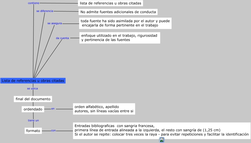 Este Cmap, tiene información relacionada con: 59-31 compilado, Lista de referencias u obras citadas da cuenta enfoque utilizado en el trabajo, rigurosidad y pertinencia de las fuentes, formato con Entradas bibliograficas con sangria francesa, primera línea de entrada alineada a la izquierda, el resto con sangría de (1,25 cm) Si el autor se repite: colocar tres veces la raya - para evitar repeticiones y facilitar la identificación, Lista de referencias u obras citadas se diferencia No admite fuentes adicionales de conducta, Lista de referencias u obras citadas contiene lista de referencias u obras citadas, Lista de referencias u obras citadas se asegura toda fuente ha sido asimilada por el autor y puede encajarla de forma pertinente en el trabajo, Lista de referencias u obras citadas se ubica final del documento, ordendado en orden alfabético, apellido autores, sin líneas vacías entre si, final del documento tiene un formato