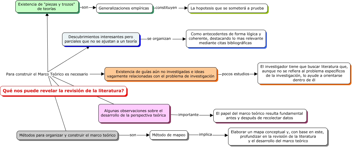 Este Cmap, tiene información relacionada con: Trabajo en grupo 1 (capitulo 4), Qué nos puede revelar la revisión de la literatura? Para construir el Marco Teòrico es necesario Métodos para organizar y construir el marco teórico, Qué nos puede revelar la revisión de la literatura? Para construir el Marco Teòrico es necesario Existencia de "piezas y trozos" de teorías, Existencia de "piezas y trozos" de teorías son Generalizaciones empíricas, Qué nos puede revelar la revisión de la literatura? Para construir el Marco Teòrico es necesario Algunas observaciones sobre el desarrollo de la perspectiva teórica, Algunas observaciones sobre el desarrollo de la perspectiva teórica importante El papel del marco teórico resulta fundamental antes y después de recolectar datos, Qué nos puede revelar la revisión de la literatura? Para construir el Marco Teòrico es necesario Existencia de guías aún no investigadas e ideas vagamente relacionadas con el problema de investigación, Métodos para organizar y construir el marco teórico son Método de mapeo, Método de mapeo implica Elaborar un mapa conceptual y, con base en este, profundizar en la revisión de la literatura y el desarrollo del marco teórico, Existencia de guías aún no investigadas e ideas vagamente relacionadas con el problema de investigación pocos estudios El investigador tiene que buscar literatura que, aunque no se refiera al problema específicos de la investigación, lo ayude a orientarse dentro de él, Descubrimientos interesantes pero parciales que no se ajustan a un teoría se organizan Como antecedentes de forma lógica y coherente, destacando lo mas relevante mediante citas bibliográficas, Generalizaciones empíricas constituyen La hopotesis que se someterá a prueba, Qué nos puede revelar la revisión de la literatura? Para construir el Marco Teòrico es necesario Descubrimientos interesantes pero parciales que no se ajustan a un teoría