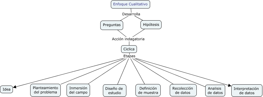 Este Cmap, tiene información relacionada con: Enfoque Cualitativo, Ciclica Etapas Idea, Ciclica Etapas Analisis de datos, Ciclica Etapas Recolección de datos, Ciclica Etapas Inmersión del campo, Enfoque Cualitativo Desarrolla Preguntas, Preguntas Acción indagatoria Ciclica, Hipótesis Acción indagatoria Ciclica, Ciclica Etapas Interpretación de datos, Ciclica Etapas Planteamiento del problema, Enfoque Cualitativo Desarrolla Hipótesis, Ciclica Etapas Definición de muestra, Ciclica Etapas Diseño de estudio