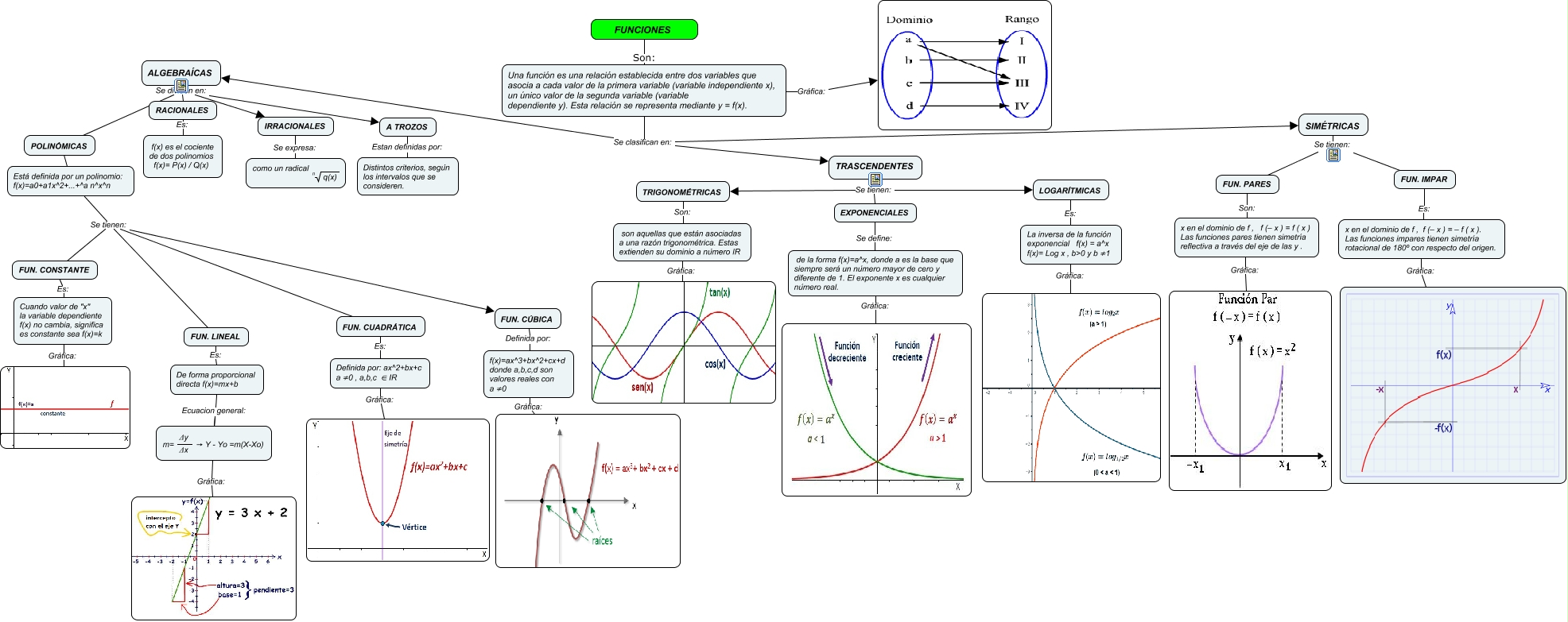 f(x)= Log x , b>0 y b≠1 </mtext> </mrow> </math> Gráfica:, FUN. CÚBICA Definida por: f(x)=ax^3+bx^2+cx+d donde a,b,c,d son valores reales con a≠0, Una función es una relación establecida entre dos variables que asocia a cada valor de la primera variable (variable independiente x), un único valor de la segunda variable (variable dependiente y). Esta relación se representa mediante y = f(x). Se clasifican en: ALGEBRAÍCAS, x en el dominio de f , f (– x ) = – f ( x ). Las funciones impares tienen simetría rotacional de 180º con respecto del origen. Gráfica:, ALGEBRAÍCAS Se dividen en: POLINÓMICAS, RACIONALES Es: f(x) es el cociente de dos polinomios f(x)= P(x) / Q(x), Una función es una relación establecida entre dos variables que asocia a cada valor de la primera variable (variable independiente x), un único valor de la segunda variable (variable dependiente y). Esta relación se representa mediante y = f(x). Se clasifican en: TRASCENDENTES, A TROZOS Estan definidas por: Distintos criterios, según los intervalos que se consideren., Cuando valor de "x" la variable dependiente f(x) no cambia, significa es constante sea f(x)=k Gráfica:, de la forma f(x)=a^x, donde a es la base que siempre será un número mayor de cero y diferente de 1. El exponente x es cualquier número real. Gráfica:, SIMÉTRICAS Se tienen: FUN. PARES, LOGARÍTMICAS Es: <math xmlns="http://www.w3.org/1998/Math/MathML"> <mrow> <mtext> La inversa de la función