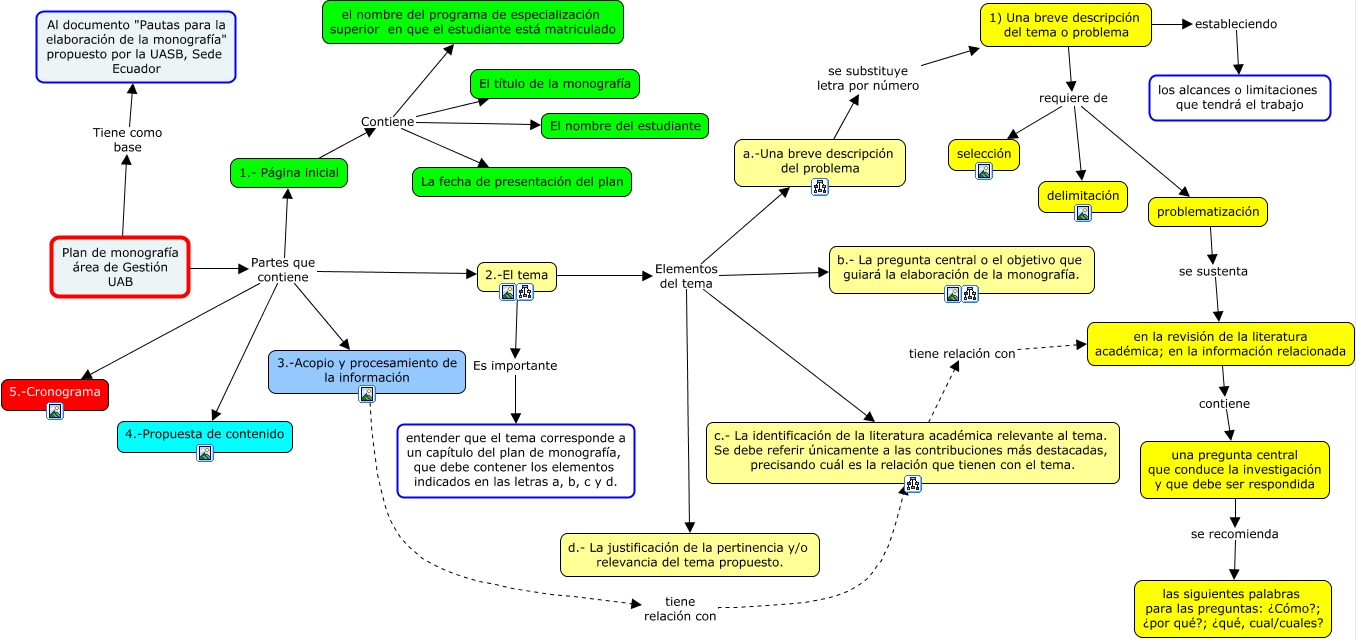 Este Cmap, tiene información relacionada con: Mapa conceptual del Plan de monografía, 1) Una breve descripción del tema o problema requiere de problematización, 2.-El tema Elementos del tema c.- La identificación de la literatura académica relevante al tema. Se debe referir únicamente a las contribuciones más destacadas, precisando cuál es la relación que tienen con el tema., 3.-Acopio y procesamiento de la información tiene relación con c.- La identificación de la literatura académica relevante al tema. Se debe referir únicamente a las contribuciones más destacadas, precisando cuál es la relación que tienen con el tema., Plan de monografía área de Gestión UAB Partes que contiene 2.-El tema, en la revisión de la literatura académica; en la información relacionada contiene una pregunta central que conduce la investigación y que debe ser respondida, 1.- Página inicial Contiene El nombre del estudiante, Plan de monografía área de Gestión UAB Partes que contiene 4.-Propuesta de contenido, 1.- Página inicial Contiene El título de la monografía, Plan de monografía área de Gestión UAB Partes que contiene 5.-Cronograma, 2.-El tema Elementos del tema d.- La justificación de la pertinencia y/o relevancia del tema propuesto., 2.-El tema Elementos del tema b.- La pregunta central o el objetivo que guiará la elaboración de la monografía., 1) Una breve descripción del tema o problema requiere de selección, 2.-El tema Elementos del tema a.-Una breve descripción del problema, Plan de monografía área de Gestión UAB Partes que contiene 1.- Página inicial, 2.-El tema Es importante entender que el tema corresponde a un capítulo del plan de monografía, que debe contener los elementos indicados en las letras a, b, c y d., a.-Una breve descripción del problema se substituye letra por número 1) Una breve descripción del tema o problema, Plan de monografía área de Gestión UAB Tiene como base Al documento "Pautas para la elaboración de la monografía" propuesto por la UASB, Sede Ecuador, 1) Una breve descripción del tema o problema estableciendo los alcances o limitaciones que tendrá el trabajo, Plan de monografía área de Gestión UAB Partes que contiene 3.-Acopio y procesamiento de la información, c.- La identificación de la literatura académica relevante al tema. Se debe referir únicamente a las contribuciones más destacadas, precisando cuál es la relación que tienen con el tema. tiene relación con en la revisión de la literatura académica; en la información relacionada
