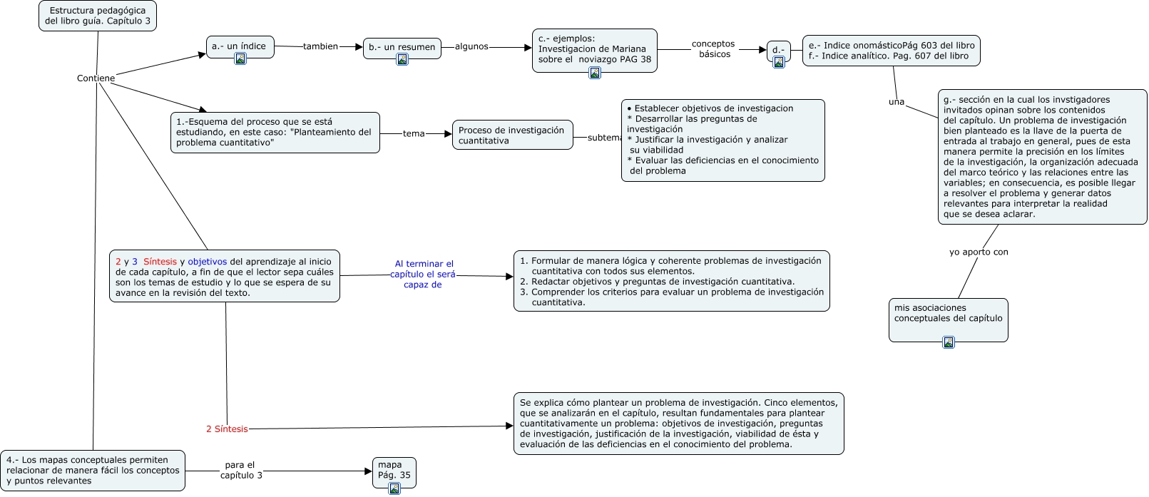 Este Cmap, tiene información relacionada con: Estructura pedagógica del capítulo 3, Proceso de investigación cuantitativa subtemas • Establecer objetivos de investigacion * Desarrollar las preguntas de investigación * Justificar la investigación y analizar su viabilidad * Evaluar las deficiencias en el conocimiento del problema, c.- ejemplos: Investigacion de Mariana sobre el noviazgo PAG 38 conceptos básicos d.-, 2 y 3 Síntesis y objetivos del aprendizaje al inicio de cada capítulo, a fin de que el lector sepa cuáles son los temas de estudio y lo que se espera de su avance en la revisión del texto. Al terminar el capítulo el será capaz de 1. Formular de manera lógica y coherente problemas de investigación cuantitativa con todos sus elementos. 2. Redactar objetivos y preguntas de investigación cuantitativa. 3. Comprender los criterios para evaluar un problema de investigación cuantitativa., b.- un resumen algunos c.- ejemplos: Investigacion de Mariana sobre el noviazgo PAG 38, Estructura pedagógica del libro guía. Capítulo 3 Contiene 4.- Los mapas conceptuales permiten relacionar de manera fácil los conceptos y puntos relevantes, Estructura pedagógica del libro guía. Capítulo 3 Contiene 1.-Esquema del proceso que se está estudiando, en este caso: "Planteamiento del problema cuantitativo", a.- un índice tambien b.- un resumen, Estructura pedagógica del libro guía. Capítulo 3 Contiene 2 y 3 Síntesis y objetivos del aprendizaje al inicio de cada capítulo, a fin de que el lector sepa cuáles son los temas de estudio y lo que se espera de su avance en la revisión del texto., 1.-Esquema del proceso que se está estudiando, en este caso: "Planteamiento del problema cuantitativo" tema Proceso de investigación cuantitativa, g.- sección en la cual los invstigadores invitados opinan sobre los contenidos del capítulo. Un problema de investigación bien planteado es la llave de la puerta de entrada al trabajo en general, pues de esta manera permite la precisión en los límites de la investigación, la organización adecuada del marco teórico y las relaciones entre las variables; en consecuencia, es posible llegar a resolver el problema y generar datos relevantes para interpretar la realidad que se desea aclarar. yo aporto con mis asociaciones conceptuales del capítulo, d.- un e.- Indice onomásticoPág 603 del libro f.- Indice analítico. Pag. 607 del libro, 4.- Los mapas conceptuales permiten relacionar de manera fácil los conceptos y puntos relevantes para el capítulo 3 mapa Pág. 35, Estructura pedagógica del libro guía. Capítulo 3 Contiene a.- un índice, 2 y 3 Síntesis y objetivos del aprendizaje al inicio de cada capítulo, a fin de que el lector sepa cuáles son los temas de estudio y lo que se espera de su avance en la revisión del texto. 2 Síntesis Se explica cómo plantear un problema de investigación. Cinco elementos, que se analizarán en el capítulo, resultan fundamentales para plantear cuantitativamente un problema: objetivos de investigación, preguntas de investigación, justificación de la investigación, viabilidad de ésta y evaluación de las deficiencias en el conocimiento del problema., e.- Indice onomásticoPág 603 del libro f.- Indice analítico. Pag. 607 del libro una g.- sección en la cual los invstigadores invitados opinan sobre los contenidos del capítulo. Un problema de investigación bien planteado es la llave de la puerta de entrada al trabajo en general, pues de esta manera permite la precisión en los límites de la investigación, la organización adecuada del marco teórico y las relaciones entre las variables; en consecuencia, es posible llegar a resolver el problema y generar datos relevantes para interpretar la realidad que se desea aclarar.