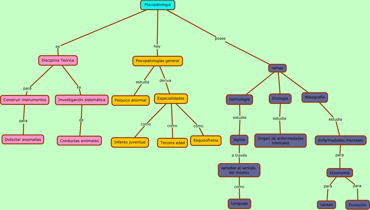 Este Cmap, tiene información relacionada con: psicopatologia, Especialidades como Infanto juventud, Especialidades como Esquizofrenia, taxonomia para Evolución, Psicopatologia posee ramas, ramas ???? Etiologia, sensible al sentido del medico como Lenguaje, ramas ???? Semiologia, signos a través sensible al sentido del medico, Psicopatologias general estudia Psiquico anormal, Disciplina Teórica para Construir instrumentos, taxonomia para causas, Enfermedades mentales para taxonomia, Nosografia estudia Enfermedades mentales, Psicopatologia es Disciplina Teórica, ramas ???? Nosografia, Etiologia estudia Origen de enfermedades mentales, Construir instrumentos para Detectar anomalías, Psicopatologia hay Psicopatologias general, Semiologia estudia signos, Disciplina Teórica es Investigación sistemática
