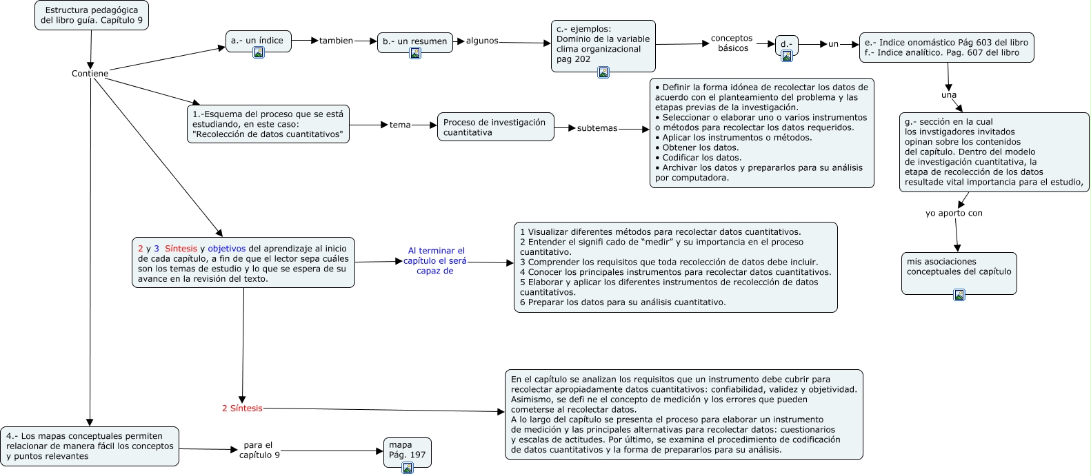 Este Cmap, tiene información relacionada con: Estructura pedagógica del capítulo 9, Proceso de investigación cuantitativa subtemas • Definir la forma idónea de recolectar los datos de acuerdo con el planteamiento del problema y las etapas previas de la investigación. • Seleccionar o elaborar uno o varios instrumentos o métodos para recolectar los datos requeridos. • Aplicar los instrumentos o métodos. • Obtener los datos. • Codificar los datos. • Archivar los datos y prepararlos para su análisis por computadora., c.- ejemplos: Dominio de la variable clima organizacional pag 202 conceptos básicos d.-, 2 y 3 Síntesis y objetivos del aprendizaje al inicio de cada capítulo, a fin de que el lector sepa cuáles son los temas de estudio y lo que se espera de su avance en la revisión del texto. Al terminar el capítulo el será capaz de 1 Visualizar diferentes métodos para recolectar datos cuantitativos. 2 Entender el signifi cado de “medir�? y su importancia en el proceso cuantitativo. 3 Comprender los requisitos que toda recolección de datos debe incluir. 4 Conocer los principales instrumentos para recolectar datos cuantitativos. 5 Elaborar y aplicar los diferentes instrumentos de recolección de datos cuantitativos. 6 Preparar los datos para su análisis cuantitativo., b.- un resumen algunos c.- ejemplos: Dominio de la variable clima organizacional pag 202, Estructura pedagógica del libro guía. Capítulo 9 Contiene 4.- Los mapas conceptuales permiten relacionar de manera fácil los conceptos y puntos relevantes, Estructura pedagógica del libro guía. Capítulo 9 Contiene 1.-Esquema del proceso que se está estudiando, en este caso: "Recolección de datos cuantitativos", a.- un índice tambien b.- un resumen, Estructura pedagógica del libro guía. Capítulo 9 Contiene 2 y 3 Síntesis y objetivos del aprendizaje al inicio de cada capítulo, a fin de que el lector sepa cuáles son los temas de estudio y lo que se espera de su avance en la revisión del texto., 1.-Esquema del proceso que se está estudiando, en este caso: "Recolección de datos cuantitativos" tema Proceso de investigación cuantitativa, g.- sección en la cual los invstigadores invitados opinan sobre los contenidos del capítulo. Dentro del modelo de investigación cuantitativa, la etapa de recolección de los datos resultade vital importancia para el estudio, yo aporto con mis asociaciones conceptuales del capítulo, d.- un e.- Indice onomástico Pág 603 del libro f.- Indice analítico. Pag. 607 del libro, 4.- Los mapas conceptuales permiten relacionar de manera fácil los conceptos y puntos relevantes para el capítulo 9 mapa Pág. 197, Estructura pedagógica del libro guía. Capítulo 9 Contiene a.- un índice, 2 y 3 Síntesis y objetivos del aprendizaje al inicio de cada capítulo, a fin de que el lector sepa cuáles son los temas de estudio y lo que se espera de su avance en la revisión del texto. 2 Síntesis En el capítulo se analizan los requisitos que un instrumento debe cubrir para recolectar apropiadamente datos cuantitativos: confiabilidad, validez y objetividad. Asimismo, se defi ne el concepto de medición y los errores que pueden cometerse al recolectar datos. A lo largo del capítulo se presenta el proceso para elaborar un instrumento de medición y las principales alternativas para recolectar datos: cuestionarios y escalas de actitudes. Por último, se examina el procedimiento de codificación de datos cuantitativos y la forma de prepararlos para su análisis., e.- Indice onomástico Pág 603 del libro f.- Indice analítico. Pag. 607 del libro una g.- sección en la cual los invstigadores invitados opinan sobre los contenidos del capítulo. Dentro del modelo de investigación cuantitativa, la etapa de recolección de los datos resultade vital importancia para el estudio,
