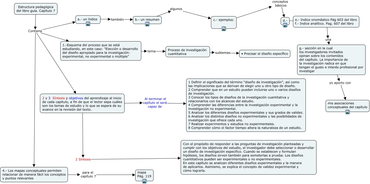 Este Cmap, tiene información relacionada con: Estructura pedagógica del capítulo 7, Proceso de investigación cuantitativa subtemas • Precisar el diseño específico, c.- ejemplos: conceptos básicos d.-, 2 y 3 Síntesis y objetivos del aprendizaje al inicio de cada capítulo, a fin de que el lector sepa cuáles son los temas de estudio y lo que se espera de su avance en la revisión del texto. Al terminar el capítulo el será capaz de 1 Definir el significado del término “diseño de investigación�?, así como las implicaciones que se derivan de elegir uno u otro tipo de diseño. 2 Comprender que en un estudio pueden incluirse uno o varios diseños de investigación. 3 Conocer los tipos de diseños de la investigación cuantitativa y relacionarlos con los alcances del estudio. 4 Comprender las diferencias entre la investigación experimental y la investigación no experimental. 5 Analizar los diferentes diseños experimentales y sus grados de validez. 6 Analizar los distintos diseños no experimentales y las posibilidades de investigación que ofrece cada uno. 7 Realizar experimentos y estudios no experimentales. 8 Comprender cómo el factor tiempo altera la naturaleza de un estudio., b.- un resumen algunos c.- ejemplos:, Estructura pedagógica del libro guía. Capítulo 7 Contiene 4.- Los mapas conceptuales permiten relacionar de manera fácil los conceptos y puntos relevantes, Estructura pedagógica del libro guía. Capítulo 7 Contiene 1.-Esquema del proceso que se está estudiando, en este caso: "Elección o desarrollo del diseño apropiado para la investigación: experimental, no experimental o múltiple", a.- un índice también b.- un resumen, Estructura pedagógica del libro guía. Capítulo 7 Contiene 2 y 3 Síntesis y objetivos del aprendizaje al inicio de cada capítulo, a fin de que el lector sepa cuáles son los temas de estudio y lo que se espera de su avance en la revisión del texto., 1.-Esquema del proceso que se está estudiando, en este caso: "Elección o desarrollo del diseño apropiado para la investigación: experimental, no experimental o múltiple" tema Proceso de investigación cuantitativa, g.- sección en la cual los investigadores invitados opinan sobre los contenidos del capítulo. La importancia de la investigación radica en que tengan el gusto e interés profesional por investigar yo aporto con mis asociaciones conceptuales del capítulo, d.- un e.- Indice onomástico Pág 603 del libro f.- Indice analítico. Pag. 607 del libro, 4.- Los mapas conceptuales permiten relacionar de manera fácil los conceptos y puntos relevantes para el capítulo 7 mapa Pág. 119, Estructura pedagógica del libro guía. Capítulo 7 Contiene a.- un índice, 2 y 3 Síntesis y objetivos del aprendizaje al inicio de cada capítulo, a fin de que el lector sepa cuáles son los temas de estudio y lo que se espera de su avance en la revisión del texto. 2 Síntesis Con el propósito de responder a las preguntas de investigación planteadas y cumplir con los objetivos del estudio, el investigador debe seleccionar o desarrollar un diseño de investigación específico. Cuando se establecen y formulan hipótesis, los diseños sirven también para someterlas a prueba. Los diseños cuantitativos pueden ser experimentales o no experimentales. En este capítulo se analizan diferentes diseños experimentales y la manera de aplicarlos. Asimismo, se explica el concepto de validez experimental y cómo lograrla., e.- Indice onomástico Pág 603 del libro f.- Indice analítico. Pag. 607 del libro una g.- sección en la cual los investigadores invitados opinan sobre los contenidos del capítulo. La importancia de la investigación radica en que tengan el gusto e interés profesional por investigar