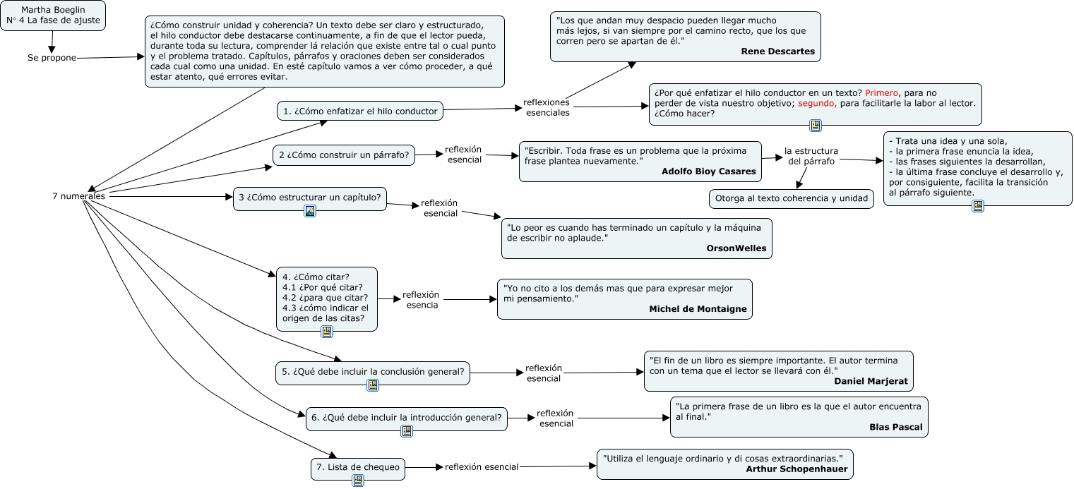 Este Cmap, tiene información relacionada con: La fase de ajuste, "Escribir. Toda frase es un problema que la próxima frase plantea nuevamente." Adolfo Bioy Casares la estructura del párrafo Otorga al texto coherencia y unidad, ¿Cómo construir unidad y coherencia? Un texto debe ser claro y estructurado, el hilo conductor debe destacarse continuamente, a fin de que el lector pueda, durante toda su lectura, comprender lá relación que existe entre tal o cual punto y el problema tratado. Capítulos, párrafos y oraciones deben ser considerados cada cual como una unidad. En esté capítulo vamos a ver cómo proceder, a qué estar atento, qué errores evitar. 7 numerales 4. ¿Cómo citar? 4.1 ¿Por qué citar? 4.2 ¿para que citar? 4.3 ¿cómo indicar el origen de las citas?, ¿Cómo construir unidad y coherencia? Un texto debe ser claro y estructurado, el hilo conductor debe destacarse continuamente, a fin de que el lector pueda, durante toda su lectura, comprender lá relación que existe entre tal o cual punto y el problema tratado. Capítulos, párrafos y oraciones deben ser considerados cada cual como una unidad. En esté capítulo vamos a ver cómo proceder, a qué estar atento, qué errores evitar. 7 numerales 2 ¿Cómo construir un párrafo?, Martha Boeglin N° 4 La fase de ajuste Se propone ¿Cómo construir unidad y coherencia? Un texto debe ser claro y estructurado, el hilo conductor debe destacarse continuamente, a fin de que el lector pueda, durante toda su lectura, comprender lá relación que existe entre tal o cual punto y el problema tratado. Capítulos, párrafos y oraciones deben ser considerados cada cual como una unidad. En esté capítulo vamos a ver cómo proceder, a qué estar atento, qué errores evitar., 7. Lista de chequeo reflexión esencial "Utiliza el lenguaje ordinario y di cosas extraordinarias." Arthur Schopenhauer, ¿Cómo construir unidad y coherencia? Un texto debe ser claro y estructurado, el hilo conductor debe destacarse continuamente, a fin de que el lector pueda, durante toda su lectura, comprender lá relación que existe entre tal o cual punto y el problema tratado. Capítulos, párrafos y oraciones deben ser considerados cada cual como una unidad. En esté capítulo vamos a ver cómo proceder, a qué estar atento, qué errores evitar. 7 numerales 7. Lista de chequeo, 4. ¿Cómo citar? 4.1 ¿Por qué citar? 4.2 ¿para que citar? 4.3 ¿cómo indicar el origen de las citas? reflexión esencia "Yo no cito a los demás mas que para expresar mejor mi pensamiento." Michel de Montaigne, ¿Cómo construir unidad y coherencia? Un texto debe ser claro y estructurado, el hilo conductor debe destacarse continuamente, a fin de que el lector pueda, durante toda su lectura, comprender lá relación que existe entre tal o cual punto y el problema tratado. Capítulos, párrafos y oraciones deben ser considerados cada cual como una unidad. En esté capítulo vamos a ver cómo proceder, a qué estar atento, qué errores evitar. 7 numerales 6. ¿Qué debe incluir la introducción general?, 6. ¿Qué debe incluir la introducción general? reflexión esencial "La primera frase de un libro es la que el autor encuentra al final." Blas Pascal, 3 ¿Cómo estructurar un capítulo? reflexión esencial "Lo peor es cuando has terminado un capítulo y la máquina de escribir no aplaude." OrsonWelles, "Escribir. Toda frase es un problema que la próxima frase plantea nuevamente." Adolfo Bioy Casares la estructura del párrafo - Trata una idea y una sola, - la primera frase enuncia la idea, - las frases siguientes la desarrollan, - la última frase concluye el desarrollo y, por consiguiente, facilita la transición al párrafo siguiente., ¿Cómo construir unidad y coherencia? Un texto debe ser claro y estructurado, el hilo conductor debe destacarse continuamente, a fin de que el lector pueda, durante toda su lectura, comprender lá relación que existe entre tal o cual punto y el problema tratado. Capítulos, párrafos y oraciones deben ser considerados cada cual como una unidad. En esté capítulo vamos a ver cómo proceder, a qué estar atento, qué errores evitar. 7 numerales 5. ¿Qué debe incluir la conclusión general?, 1. ¿Cómo enfatizar el hilo conductor reflexiones esenciales ¿Por qué enfatizar el hilo conductor en un texto? Primero, para no perder de vista nuestro objetivo; segundo, para facilitarle la labor al lector. ¿Cómo hacer?, ¿Cómo construir unidad y coherencia? Un texto debe ser claro y estructurado, el hilo conductor debe destacarse continuamente, a fin de que el lector pueda, durante toda su lectura, comprender lá relación que existe entre tal o cual punto y el problema tratado. Capítulos, párrafos y oraciones deben ser considerados cada cual como una unidad. En esté capítulo vamos a ver cómo proceder, a qué estar atento, qué errores evitar. 7 numerales 3 ¿Cómo estructurar un capítulo?, ¿Cómo construir unidad y coherencia? Un texto debe ser claro y estructurado, el hilo conductor debe destacarse continuamente, a fin de que el lector pueda, durante toda su lectura, comprender lá relación que existe entre tal o cual punto y el problema tratado. Capítulos, párrafos y oraciones deben ser considerados cada cual como una unidad. En esté capítulo vamos a ver cómo proceder, a qué estar atento, qué errores evitar. 7 numerales 1. ¿Cómo enfatizar el hilo conductor, 2 ¿Cómo construir un párrafo? reflexión esencial "Escribir. Toda frase es un problema que la próxima frase plantea nuevamente." Adolfo Bioy Casares, 5. ¿Qué debe incluir la conclusión general? reflexión esencial "El fin de un libro es siempre importante. El autor termina con un tema que el lector se llevará con él." Daniel Marjerat, 1. ¿Cómo enfatizar el hilo conductor reflexiones esenciales "Los que andan muy despacio pueden llegar mucho más lejos, si van siempre por el camino recto, que los que corren pero se apartan de él." Rene Descartes