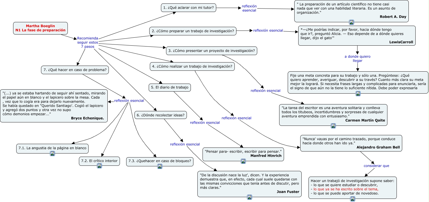 Este Cmap, tiene información relacionada con: La fase de preparación, 3. ¿Cómo presentar un proyecto de investigación? reflexión esencial "La tarea del escritor es una aventura solitaria y conlleva todos los titubeos, incertidumbres y sorpresas de cualquier aventura emprendida con entusiasmo." Carmen Martín Qaite, Martha Boeglin N1 La fase de preparación Recomienda seguir estos 7 pasos 3. ¿Cómo presentar un proyecto de investigación?, 7. ¿Qué hacer en caso de problema? reflexión esencial 7.1. La angustia de la página en blanco, Martha Boeglin N1 La fase de preparación Recomienda seguir estos 7 pasos 5. El diario de trabajo, 6. ¿Dónde recolectar ideas? reflexión esencial "De la discusión nace la luz', dicen. Y la experiencia demuestra que, en efecto, cada cual suele quedarse con las mismas convicciones que tenía antes de discutir, pero más claras." Joan Fuster, Martha Boeglin N1 La fase de preparación Recomienda seguir estos 7 pasos 7. ¿Qué hacer en caso de problema?, 4. ¿Cómo realizar un trabajo de investigación? reflexión esencial "Nunca' vayas por el camino trazado, porque conduce hacia donde otros han ido ya." Alejandro Graham Bell, 1. ¿Qué aclarar con mi tutor? reflexión esencial " La preparación de un artículo científico no tiene casi nada que ver con una habilidad literaria. Es un asunto de organización." Robert A. Day, 7. ¿Qué hacer en caso de problema? reflexión esencial 7.3. ¿Quehacer en caso de bloqueo?, 5. El diario de trabajo reflexión esencial "Pensar para- escribir, escribir para pensar." Manfred Htnrich, Martha Boeglin N1 La fase de preparación Recomienda seguir estos 7 pasos 6. ¿Dónde recolectar ideas?, *—¿Me podrías indicar, por favor, hacia dónde tengo que ir?, preguntó Alicia. — Eso depende de a dónde quieres llegar, dijo el gato'" LewisCarroll a donde quiero llegar Fije una meta concreta para su trabajo y sólo una. Pregúntese: ¿Qué quiero aprender, averiguar, descubrir a su través? Cuanto más clara su meta mejor la logrará. Si necesita frases largas y complicadas para enunciarla, sería el signo de que aún no la tiene lo suficiente nítida. Debe poder expresarla, Martha Boeglin N1 La fase de preparación Recomienda seguir estos 7 pasos 4. ¿Cómo realizar un trabajo de investigación?, 2. ¿Cómo preparar un trabajo de investigación? reflexión esencial *—¿Me podrías indicar, por favor, hacia dónde tengo que ir?, preguntó Alicia. — Eso depende de a dónde quieres llegar, dijo el gato'" LewisCarroll, 7. ¿Qué hacer en caso de problema? reflexión esencial "(...) ya se estaba hartando de seguir ahí sentado, mirando el papel aún en blanco y el lapicero sobre la mesa. Cada , vez que lo cogía era para dejarlo nuevamente. Se había quedado en "Querido Santiago'. Cogió el lapicero y agregó dos puntos y otra vez no supo cómo demonios empezar..." Bryce Echenique., Martha Boeglin N1 La fase de preparación Recomienda seguir estos 7 pasos 1. ¿Qué aclarar con mi tutor?, "Nunca' vayas por el camino trazado, porque conduce hacia donde otros han ido ya." Alejandro Graham Bell considerar que Hacer un trabajó de investigación supone saber: - lo que se quiere estudiar o descubrir, - lo que ya se ha escrito sobre el tema, - lo que se puede aportar de novedoso., Martha Boeglin N1 La fase de preparación Recomienda seguir estos 7 pasos 2. ¿Cómo preparar un trabajo de investigación?, 7. ¿Qué hacer en caso de problema? reflexión esencial 7.2. El crítico interior