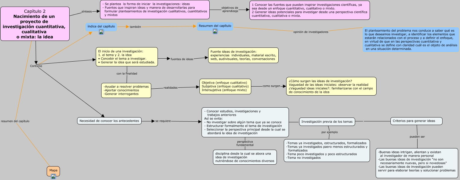 Este Cmap, tiene información relacionada con: Capitulo 2, - Conocer estudios, investigaciones y trabajos anteriores Así se evita: - No investigar sobre algún tema que ya se conoce - Estructurar formalmente el tema de investigación - Seleccionar la perspectiva principal desde la cual se abordará la idea de investigación perspectiva fundamental disciplina desde la cual se abora una idea de investigación nutriéndose de conocimientos diversos, -Ayudar a resolver problemas -Aportar conocimientos -Generar interrogantes realidades Objetiva (enfoque cualitativo) Subjetiva (enfoque cualitativo) Intersujetiva (enfoque mixto), Capítulo 2 Nacimiento de un proyecto de investigación cuantitativa, cualitativa o mixta: la idea síntesis - Se plantea la forma de iniciar la investigaciones: ideas - Fuentes que inspiran ideas y manera de desarrollarlas para formular planteamientos de investigación cualitativos, cuantitativos y mixtos, - Conocer estudios, investigaciones y trabajos anteriores Así se evita: - No investigar sobre algún tema que ya se conoce - Estructurar formalmente el tema de investigación - Seleccionar la perspectiva principal desde la cual se abordará la idea de investigación Investigación previa de los temas, Capítulo 2 Nacimiento de un proyecto de investigación cuantitativa, cualitativa o mixta: la idea Contiene índice del capítulo, Capítulo 2 Nacimiento de un proyecto de investigación cuantitativa, cualitativa o mixta: la idea Contiene Necesidad de conocer los antecedentes, El inicio de una investigación: 1. el tema y 2. la idea • Concebir el tema a investigar. • Generar la idea que será estudiada. con la finalidad -Ayudar a resolver problemas -Aportar conocimientos -Generar interrogantes, Objetiva (enfoque cualitativo) Subjetiva (enfoque cualitativo) Intersujetiva (enfoque mixto) como surgen ¿Cómo surgen las ideas de investigación? Vaguedad de las ideas iniciales: observar la realidad ¿Vaguedad ideas iniciales?: familiarizarse con el campo de conocimiento de la idea, Resumen del capítulo opinión de investigadores El planteamiento del problema nos conduce a saber qué es lo que deseamos investigar, a identificar los elementos que estarán relacionados con el proceso y a definir el enfoque, en virtud de que en las perspectivas cuantitativa y cualitativa se define con claridad cuál es el objeto de análisis en una situación determinada., índice del capítulo también Resumen del capítulo, Investigación previa de los temas por ejemplo -Temas ya investigados, estructurados, formalizados -Temas ya investigados paero menos estructurados y formalizados -Tema poco investigados y poco estructurados -Tema no investigados, Investigación previa de los temas Criterios para generar ideas, El inicio de una investigación: 1. el tema y 2. la idea • Concebir el tema a investigar. • Generar la idea que será estudiada. fuentes de ideas Fuente ideas de investigación: experiencias individuales, material escrito, web, audivisuales, teorías, conversaciones, Criterios para generar ideas pueden ser -Buenas ideas intrigan, alientan y existan al investigador de manera personal -Las buenas ideas de investigación "no son necesariamente nuevas, pero si novedosas" -Las buenas ideas de investigación pueden servir para elaborar teorías y solucionar problemas, Capítulo 2 Nacimiento de un proyecto de investigación cuantitativa, cualitativa o mixta: la idea Contiene El inicio de una investigación: 1. el tema y 2. la idea • Concebir el tema a investigar. • Generar la idea que será estudiada., Capítulo 2 Nacimiento de un proyecto de investigación cuantitativa, cualitativa o mixta: la idea resumen del capítulo Mapa, Necesidad de conocer los antecedentes se requiere - Conocer estudios, investigaciones y trabajos anteriores Así se evita: - No investigar sobre algún tema que ya se conoce - Estructurar formalmente el tema de investigación - Seleccionar la perspectiva principal desde la cual se abordará la idea de investigación, - Se plantea la forma de iniciar la investigaciones: ideas - Fuentes que inspiran ideas y manera de desarrollarlas para formular planteamientos de investigación cualitativos, cuantitativos y mixtos objetivos de aprendizaje 1 Conocer las fuentes que pueden inspirar investigaciones científicas, ya sea desde un enfoque cuantitativo, cualitativo o mixto. 2 Generar ideas potenciales para investigar desde una perspectiva científica cuantitativa, cualitativa o mixta.