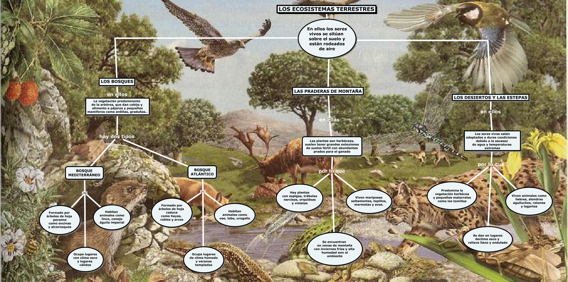 Este Cmap, tiene información relacionada con: LOS ECOSISTEMAS TERRESTRES, Las plantas son herbáceas, suelen tener grandes extexiones de suelos fértil con abundantes prados para el ganado por lo que Se encuentran en zonas de montaña con inviernos fríos y alta humedad enn el ambiente, BOSQUE MEDITERRÁNEO es Ocupa lugares con clima seco y lugares cálidos, LAS PRADERAS DE MONTAÑA en ellas Las plantas son herbáceas, suelen tener grandes extexiones de suelos fértil con abundantes prados para el ganado, LOS DESIERTOS Y LAS ESTEPAS en ellos Los seres vivos están adaptados a duras condiciones debido a la escasez de agua y temperaturas extremas, Las plantas son herbáceas, suelen tener grandes extexiones de suelos fértil con abundantes prados para el ganado por lo que Hay plantas con espigas, tréboles narcisos, orquídeas y violetas, Los seres vivos están adaptados a duras condiciones debido a la escasez de agua y temperaturas extremas por lo que Viven animales como liebres, alondras aguiluchos, ratones y lagartos, BOSQUE ATLÁNTICO es Ocupa lugares de clima húmedo y veranos templados, Los seres vivos están adaptados a duras condiciones debido a la escasez de agua y temperaturas extremas por lo que Se dan en lugares declima seco y relieve llano y ondulado, La vegetación predominante de la arbórea, que dan cobijo y alimento a pájaros y pequeños mamíferos como ardillas, graduñas.. hay dos tipos BOSQUE ATLÁNTICO, BOSQUE ATLÁNTICO es Habitan animales como oso, lobo, urogallo, Las plantas son herbáceas, suelen tener grandes extexiones de suelos fértil con abundantes prados para el ganado por lo que Viven mariposas saltamontes, topillos, marmotas y aves., BOSQUE ATLÁNTICO es Formado por árboles de hoja caduca como hayas, robles y arces, BOSQUE MEDITERRÁNEO es Habitan animales como lince, conejo águila imperial, LOS ECOSISTEMAS TERRESTRES en ellos En ellos los seres vivos se sitúan sobre el suelo y están rodeados de aire, La vegetación predominante de la arbórea, que dan cobijo y alimento a pájaros y pequeños mamíferos como ardillas, graduñas.. hay dos tipos BOSQUE MEDITERRÁNEO, En ellos los seres vivos se sitúan sobre el suelo y están rodeados de aire ???? LOS DESIERTOS Y LAS ESTEPAS, LOS BOSQUES en ellos La vegetación predominante de la arbórea, que dan cobijo y alimento a pájaros y pequeños mamíferos como ardillas, graduñas.., Los seres vivos están adaptados a duras condiciones debido a la escasez de agua y temperaturas extremas por lo que Predomina la vegetación herbácea y pequeños matorrales como los tomillos, En ellos los seres vivos se sitúan sobre el suelo y están rodeados de aire ???? LAS PRADERAS DE MONTAÑA, En ellos los seres vivos se sitúan sobre el suelo y están rodeados de aire ???? LOS BOSQUES