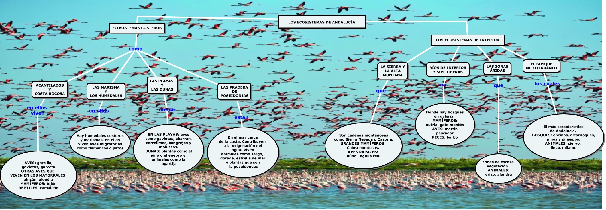 Este Cmap, tiene información relacionada con: LOS ECOSISTEMASDE ANDALUCÍA, LOS ECOSISTEMAS DE ANDALUCÍA ???? ECOSISTEMAS COSTEROS, LAS MARISMA Y LOS HUMEDALES en ellos Hay humedales costeros y marismas. En ellas viven aves migratorias como flamencos o patos, LAS PLAYAS Y LAS DUNAS donde EN LAS PLAYAS: aves como gaviotas, charrán, correlimos, cangrejos y moluscos. DUNAS: plantas como el pino o el enebro y animales como la lagartija, EL BOSQUE MEDITERRÁNEO los cuales El más característico de Andalucía. BOSQUES: encinas, alcornoques, pinos y pinsapos. ANIMALES: ciervo, lince, milano., LOS ECOSISTEMAS DE ANDALUCÍA ???? LOS ECOSISTEMAS DE INTERIOR, ECOSISTEMAS COSTEROS como LAS PRADERA DE POSEIDONIAS, LOS ECOSISTEMAS DE INTERIOR ???? RÍOS DE INTERIOR Y SUS RIBERAS, RÍOS DE INTERIOR Y SUS RIBERAS en Donde hay bosques en galería. MAMÍFEROS: nutria, gato montés AVES: martín pescador PECES: barbo, ECOSISTEMAS COSTEROS como ACANTILADOS Y COSTA ROCOSA, LOS ECOSISTEMAS DE INTERIOR ???? EL BOSQUE MEDITERRÁNEO, LA SIERRA Y LA ALTA MONTAÑA que Son cadenas montañosas como Sierra Nevada o Cazorla. GRANDES MAMÍFEROS: Cabra montesas, AVES RAPACES: búho , aguila real, ECOSISTEMAS COSTEROS como LAS PLAYAS Y LAS DUNAS, ACANTILADOS Y COSTA ROCOSA en ellos viven AVES: garcilla, gaviotas, garceta OTRAS AVES QUE VIVEN EN LOS MATORRALES: pinzón, alondra MAMÍFEROS: tejón REPTILES: camaleón, LAS ZONAS ÁRIDAS que Zonas de escasa vegetación. ANIMALES: erizo, alondra, LOS ECOSISTEMAS DE INTERIOR ???? LAS ZONAS ÁRIDAS, LOS ECOSISTEMAS DE INTERIOR ???? LA SIERRA Y LA ALTA MONTAÑA, ECOSISTEMAS COSTEROS como LAS MARISMA Y LOS HUMEDALES, LAS PRADERA DE POSEIDONIAS están En el mar cerca de la costa. Contribuyen a la oxigenación del agua. Viven animales como sargo, dorada, estrella de mar y plantas que son la poseidoneas