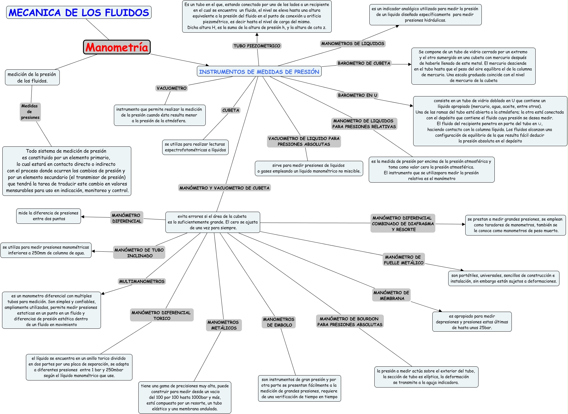 Este Cmap, tiene información relacionada con: MECANICA DE LOS FLUIDOS, INSTRUMENTOS DE MEDIDAS DE PRESIÓN BAROMETRO EN U consiste en un tubo de vidrio doblado en U que contiene un líquido apropiado (mercurio, agua, aceite, entre otros). Una de las ramas del tubo está abierta a la atmósfera; la otra está conectada con el depósito que contiene el fluido cuya presión se desea medir. El fluido del recipiente penetra en parte del tubo en ∪, haciendo contacto con la columna líquida. Los fluidos alcanzan una configuración de equilibrio de la que resulta fácil deducir la presión absoluta en el depósito, evita errores si el área de la cubeta es lo suficientemente grande. El cero se ajusta de una vez para siempre. MANÓMETRO DE FUELLE METÁLICO son portátiles, universales, sencillos de construcción e instalación, sin embargo están sujetos a deformaciones., evita errores si el área de la cubeta es lo suficientemente grande. El cero se ajusta de una vez para siempre. MANÓMETRO DIFERENCIAL TORICO el líquido se encuentra en un anillo torico dividido en dos partes por una placa de separación, se adapta a diferentes presiones entre 1 bar y 250mbar según el líquido manométrico que use., evita errores si el área de la cubeta es lo suficientemente grande. El cero se ajusta de una vez para siempre. MANÓMETRO DE MEMBRANA es apropiado para medir depresiones y presiones estas últimas de hasta unos 25bar., INSTRUMENTOS DE MEDIDAS DE PRESIÓN MANOMETRO DE LIQUIDOS PARA PRESIONES RELATIVAS es la medida de presión por encima de la presión atmosférica y toma como valor cero la presión atmosférica. El instrumento que se utilizapara medir la presión relativa es el manómetro, INSTRUMENTOS DE MEDIDAS DE PRESIÓN VACUOMETRO instrumento que permite realizar la medición de la presión cuando ésta resulta menor a la presión de la atmósfera., evita errores si el área de la cubeta es lo suficientemente grande. El cero se ajusta de una vez para siempre. MANOMETROS DE EMBOLO son instrumentos de gran presión y por otra parte se presentan fácilmente a la medición de grandes presiones, requiere de una verificación de tiempo en tiempo, INSTRUMENTOS DE MEDIDAS DE PRESIÓN CUBETA se utiliza para realizar lecturas espectrofotométricas a líquidos, INSTRUMENTOS DE MEDIDAS DE PRESIÓN TUBO PIEZOMETRICO Es un tubo en el que, estando conectado por uno de los lados a un recipiente en el cual se encuentra un fluido, el nivel se eleva hasta una altura equivalente a la presión del fluido en el punto de conexión u orificio piezométrico, es decir hasta el nivel de carga del mismo. Dicha altura H, es la suma de la altura de presión h, y la altura de cota z., evita errores si el área de la cubeta es lo suficientemente grande. El cero se ajusta de una vez para siempre. MANÓMETRO DE TUBO INCLINADO se utiliza para medir presiones manométricas inferiores a 250mm de columna de agua., medición de la presión de los fluidos. Medidas de presiones Todo sistema de medición de presión es constituido por un elemento primario, lo cual estará en contacto directo o indirecto con el proceso donde ocurren los cambios de presión y por un elemento secundario (el transmisor de presión) que tendrá la tarea de traducir este cambio en valores mensurables para uso en indicación, monitoreo y control., INSTRUMENTOS DE MEDIDAS DE PRESIÓN VACUOMETRO DE LIQUIDO PARA PRESIONES ABSOLUTAS sirve para medir presiones de liquidos o gases empleando un liquido manométrico no miscible., evita errores si el área de la cubeta es lo suficientemente grande. El cero se ajusta de una vez para siempre. MANÓMETRO DIFERENCIAL mide la diferencia de presiones entre dos puntos, evita errores si el área de la cubeta es lo suficientemente grande. El cero se ajusta de una vez para siempre. MANÓMETRO DIFERENCIAL COMBINADO DE DIAFRAGMA Y RESORTE se prestan a medir grandes presiones, se emplean como taradores de manometros, también se le conoce como manometros de peso muerto., INSTRUMENTOS DE MEDIDAS DE PRESIÓN MANOMETROS DE LIQUIDOS es un indicador analógico utilizado para medir la presión de un liquido diseñado específicamente para medir presiones hidráulicas., INSTRUMENTOS DE MEDIDAS DE PRESIÓN BAROMETRO DE CUBETA Se compone de un tubo de vidrio cerrado por un extremo y el otro sumergido en una cubeta con mercurio después de haberle llenado de este metal. El mercurio desciende en el tubo hasta que el peso del aire equilibra el de la columna de mercurio. Una escala graduada coincide con el nivel de mercurio de la cubeta, MECANICA DE LOS FLUIDOS Manometría medición de la presión de los fluidos., evita errores si el área de la cubeta es lo suficientemente grande. El cero se ajusta de una vez para siempre. MULTIMANOMETROS es un manometro diferencial con multiples tubos para medición. Son simples y confiables, ampliamente utilizados, permite medir presiones estaticas en un punto en un fluido y diferencias de presión estática dentro de un fluido en movimiento, MECANICA DE LOS FLUIDOS Manometría INSTRUMENTOS DE MEDIDAS DE PRESIÓN, evita errores si el área de la cubeta es lo suficientemente grande. El cero se ajusta de una vez para siempre. MANÓMETRO DE BOURDON PARA PRESIONES ABSOLUTAS la presión a medir actúa sobre el exterior del tubo, la sección de tubo es elíptica, la deformación se transmite a la aguja indicadora.
