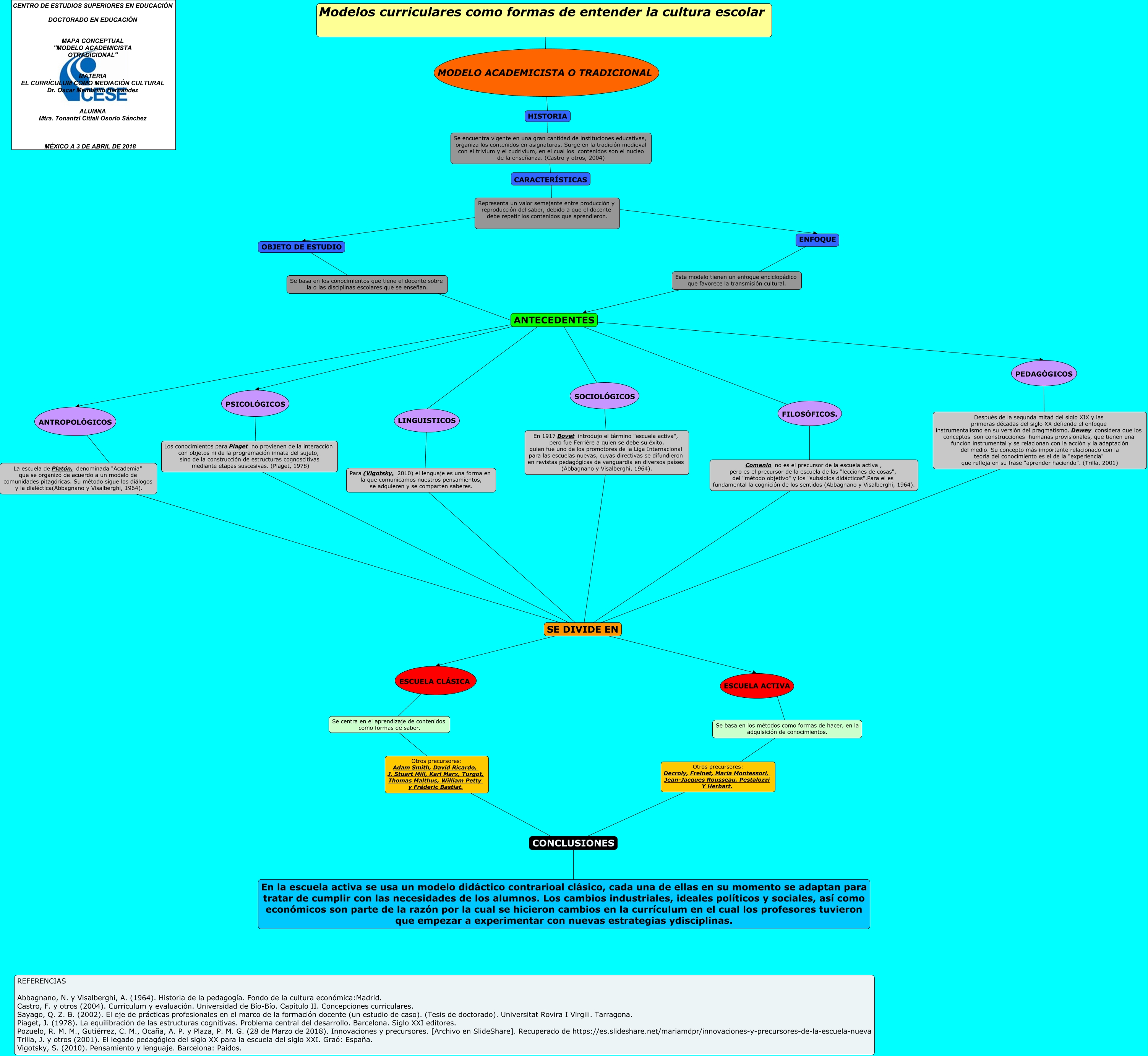Este Cmap, tiene información relacionada con: MODELO ACADEMICISTA, MODELO ACADEMICISTA O TRADICIONAL ???? HISTORIA, Se basa en los métodos como formas de hacer, en la adquisición de conocimientos. ???? ESCUELA ACTIVA, ANTECEDENTES ???? FILOSÓFICOS., Representa un valor semejante entre producción y reproducción del saber, debido a que el docente debe repetir los contenidos que aprendieron. ???? ENFOQUE, ANTECEDENTES ???? ANTROPOLÓGICOS, OBJETO DE ESTUDIO ???? Se basa en los conocimientos que tiene el docente sobre la o las disciplinas escolares que se enseñan., SE DIVIDE EN ???? ESCUELA ACTIVA, Otros precursores: Decroly, Freinet, María Montessori, Jean-Jacques Rousseau, Pestalozzi Y Herbart. ???? CONCLUSIONES, ANTECEDENTES ???? PEDAGÓGICOS, Este modelo tienen un enfoque enciclopédico que favorece la transmisión cultural. ???? ANTECEDENTES, Representa un valor semejante entre producción y reproducción del saber, debido a que el docente debe repetir los contenidos que aprendieron. ???? OBJETO DE ESTUDIO, SE DIVIDE EN ???? Los conocimientos para Piaget no provienen de la interacción con objetos ni de la programación innata del sujeto, sino de la construcción de estructuras cognoscitivas mediante etapas suscesivas. (Piaget, 1978), PSICOLÓGICOS ???? Los conocimientos para Piaget no provienen de la interacción con objetos ni de la programación innata del sujeto, sino de la construcción de estructuras cognoscitivas mediante etapas suscesivas. (Piaget, 1978), FILOSÓFICOS. ???? Comenio no es el precursor de la escuela activa , pero es el precursor de la escuela de las "lecciones de cosas", del "método objetivo" y los "subsidios didácticos".Para el es fundamental la cognición de los sentidos (Abbagnano y Visalberghi, 1964)., Se basa en los conocimientos que tiene el docente sobre la o las disciplinas escolares que se enseñan. ???? ANTECEDENTES, SE DIVIDE EN ???? Después de la segunda mitad del siglo XIX y las primeras décadas del siglo XX defiende el enfoque instrumentalismo en su versión del pragmatismo. Dewey considera que los conceptos son construcciones humanas provisionales, que tienen una función instrumental y se relacionan con la acción y la adaptación del medio. Su concepto más importante relacionado con la teoría del conocimiento es el de la "experiencia" que refleja en su frase "aprender haciendo". (Trilla, 2001), Se centra en el aprendizaje de contenidos como formas de saber. ???? Otros precursores: Adam Smith, David Ricardo, J. Stuart Mill, Karl Marx, Turgot, Thomas Malthus, William Petty y Fréderic Bastiat., CARACTERÍSTICAS ???? Representa un valor semejante entre producción y reproducción del saber, debido a que el docente debe repetir los contenidos que aprendieron., SE DIVIDE EN ???? Comenio no es el precursor de la escuela activa , pero es el precursor de la escuela de las "lecciones de cosas", del "método objetivo" y los "subsidios didácticos".Para el es fundamental la cognición de los sentidos (Abbagnano y Visalberghi, 1964)., MODELO ACADEMICISTA O TRADICIONAL ???? Modelos curriculares como formas de entender la cultura escolar