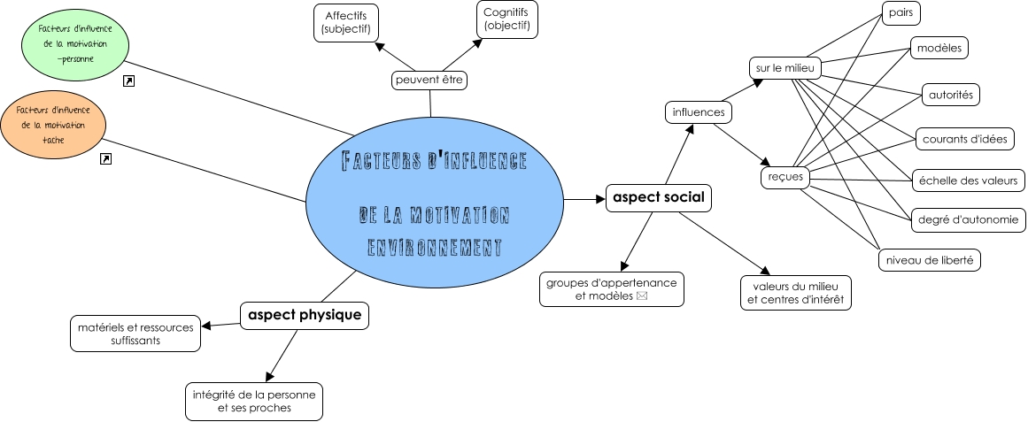 Cette carte de concepts créée avec IHMC CmapTools traite de: Facteurs d'influence de la motivation (environnement), influences sur le milieu échelle des valeurs, influences reçues modèles, Facteurs d'influence de la motivation tache ???? Facteurs d'influence de la motivation environnement, influences sur le milieu degré d'autonomie, Facteurs d'influence de la motivation environnement aspect social valeurs du milieu et centres d'intérêt, influences sur le milieu courants d'idées, Facteurs d'influence de la motivation environnement aspect physique matériels et ressources suffissants, Facteurs d'influence de la motivation environnement aspect physique intégrité de la personne et ses proches, Facteurs d'influence de la motivation environnement peuvent être Affectifs (subjectif), Facteurs d'influence de la motivation environnement peuvent être Cognitifs (objectif), influences reçues degré d'autonomie, influences reçues autorités, influences sur le milieu pairs, influences sur le milieu modèles, Facteurs d'influence de la motivation environnement aspect social groupes d'appertenance et modèles *, influences sur le milieu autorités, influences reçues échelle des valeurs, influences sur le milieu niveau de liberté, influences reçues courants d'idées, influences reçues pairs