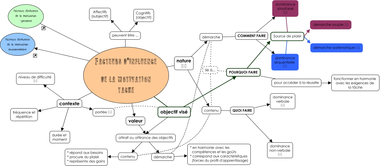 Cette carte de concepts créée avec IHMC CmapTools traite de: Facteurs d'influence de la motivation (tâche), démarche COMMENT FAIRE dominance séquentielle *, Facteurs d'influence de la motivation tache peuvent être ... Cognitifs (objectif), dominance simultané * Source de plaisir démarche systèmatique *, attrait ou attirance des objectifs contenu * répond aux besoins * procure du plaisir * représente des gains, POURQUOI FAIRE Source de plaisir démarche systèmatique *, Facteurs d'influence de la motivation tache contexte fréquence et répétition, Facteurs d'influence de la motivation tache nature * contenu, portée * objectif visé attrait ou attirance des objectifs, Facteurs d'influence de la motivation tache ???? Facteurs d'influence de la motivation environnement, Facteurs d'influence de la motivation tache contexte portée *, Facteurs d'influence de la motivation tache nature * démarche, dominance séquentielle * Source de plaisir démarche souple *, Facteurs d'influence de la motivation tache objectif visé POURQUOI FAIRE, dominance séquentielle * Source de plaisir démarche systèmatique *, Facteurs d'influence de la motivation tache peuvent être ... Affectifs (subjectif), portée * objectif visé POURQUOI FAIRE, Facteurs d'influence de la motivation tache valeur attrait ou attirance des objectifs, contenu QUOI FAIRE dominance verbale *, POURQUOI FAIRE lié à... démarche, POURQUOI FAIRE Source de plaisir démarche souple *