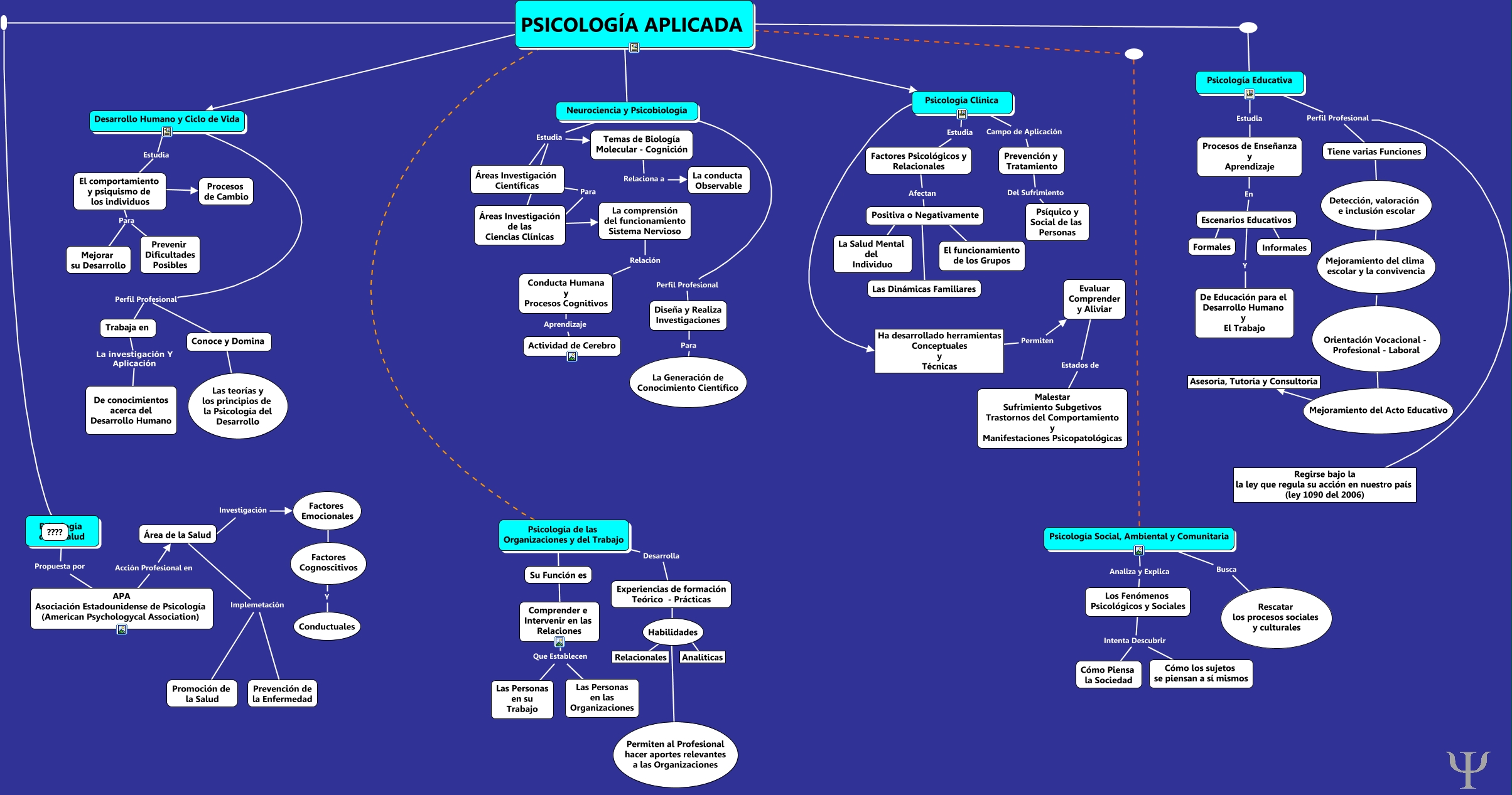Este Cmap, tiene información relacionada con: MAPA PSICOLOGÍA APLICADA, PSICOLOGÍA APLICADA ???? Desarrollo Humano y Ciclo de Vida, PSICOLOGÍA APLICADA ???? Psicología Social, Ambiental y Comunitaria, Neurociencia y Psicobiología Estudia Áreas Investigación de las Ciencias Clínicas, La comprensión del funcionamiento Sistema Nervioso Relación Conducta Humana y Procesos Cognitivos, Mejoramiento del clima escolar y la convivencia ???? Orientación Vocacional - Profesional - Laboral, Psicología Clínica ???? Ha desarrollado herramientas Conceptuales y Técnicas, Psicología Educativa Perfil Profesional Regirse bajo la la ley que regula su acción en nuestro país (ley 1090 del 2006), Comprender e Intervenir en las Relaciones Que Establecen Las Personas en su Trabajo, PSICOLOGÍA APLICADA Psicología de la Salud, Neurociencia y Psicobiología Estudia Áreas Investigación Científicas, Neurociencia y Psicobiología Perfil Profesional Diseña y Realiza Investigaciones, Psicología Social, Ambiental y Comunitaria Busca Rescatar los procesos sociales y culturales, Orientación Vocacional - Profesional - Laboral ???? Mejoramiento del Acto Educativo, Positiva o Negativamente ???? Las Dinámicas Familiares, Positiva o Negativamente ???? El funcionamiento de los Grupos, Diseña y Realiza Investigaciones Para La Generación de Conocimiento Científico, El comportamiento y psiquismo de los individuos Para Mejorar su Desarrollo, Psicología Educativa Perfil Profesional Tiene varias Funciones, Habilidades ???? Relacionales, El comportamiento y psiquismo de los individuos ???? Procesos de Cambio