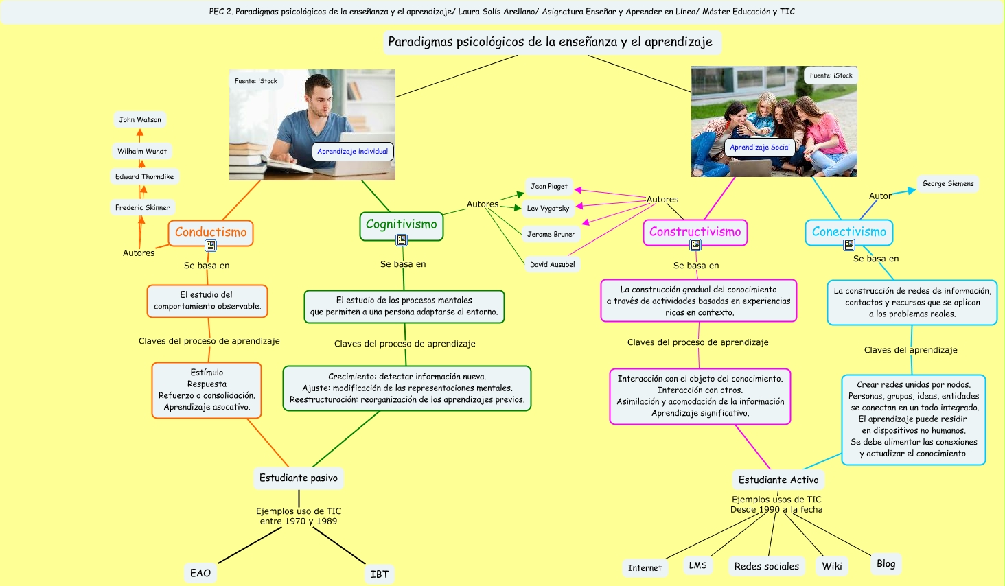 Este Cmap, tiene información relacionada con: PEC 2_Laura_Solís, Conductismo Autores Frederic Skinner, Conectivismo ???? Aprendizaje Social, Constructivismo Autores Jean Piaget, Paradigmas psicológicos de la enseñanza y el aprendizaje Aprendizaje individual, El estudio de los procesos mentales que permiten a una persona adaptarse al entorno. Claves del proceso de aprendizaje Crecimiento: detectar información nueva. Ajuste: modificación de las representaciones mentales. Reestructuración: reorganización de los aprendizajes previos., Constructivismo Se basa en La construcción gradual del conocimiento a través de actividades basadas en experiencias ricas en contexto., Cognitivismo Autores Lev Vygotsky, El estudio del comportamiento observable. Claves del proceso de aprendizaje Estímulo Respuesta Refuerzo o consolidación. Aprendizaje asocativo., Paradigmas psicológicos de la enseñanza y el aprendizaje ???? Aprendizaje Social, Estudiante Activo ???? Crear redes unidas por nodos. Personas, grupos, ideas, entidades se conectan en un todo integrado. El aprendizaje puede residir en dispositivos no humanos. Se debe alimentar las conexiones y actualizar el conocimiento., Conectivismo Se basa en La construcción de redes de información, contactos y recursos que se aplican a los problemas reales., Cognitivismo Autores David Ausubel, Estudiante pasivo Ejemplos uso de TIC entre 1970 y 1989 IBT, Constructivismo ???? Aprendizaje Social, Estudiante Activo Ejemplos usos de TIC Desde 1990 a la fecha LMS, Conductismo Se basa en El estudio del comportamiento observable., Estudiante pasivo ???? Estímulo Respuesta Refuerzo o consolidación. Aprendizaje asocativo., Conductismo Aprendizaje individual, Conductismo Autores Wilhelm Wundt, Conectivismo Autor George Siemens