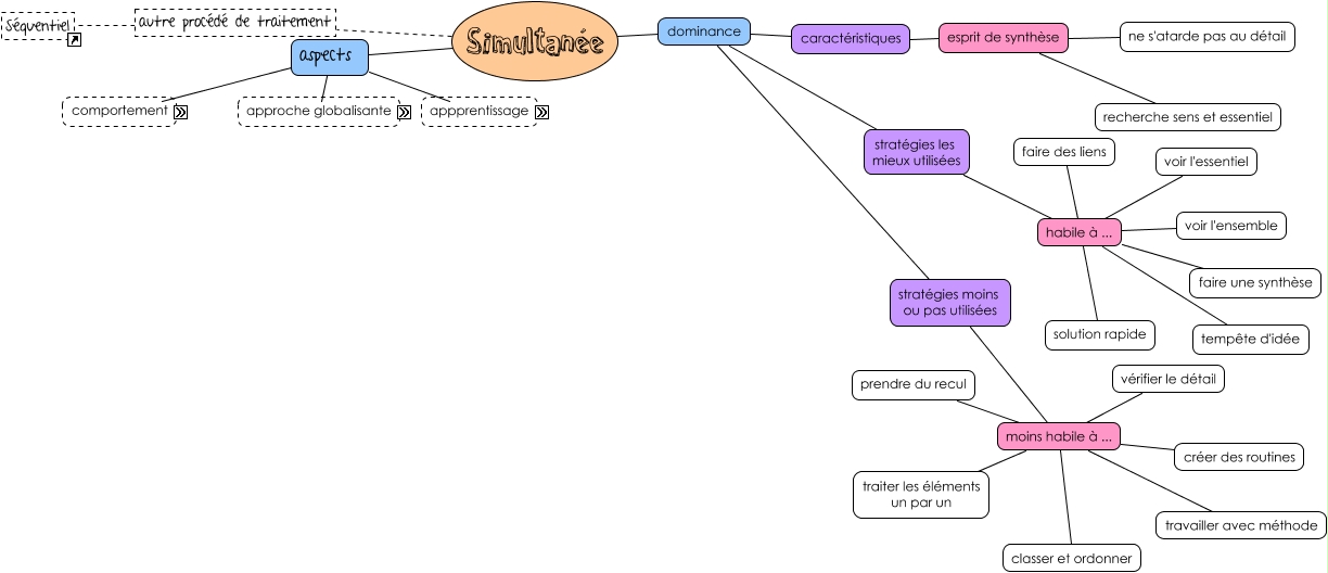 Cette carte de concepts créée avec IHMC CmapTools traite de: Simultanée, traits de personnalité sa pensée on peut faire autrement, stratégies moins ou pas utilisées moins habile à ... traiter les éléments un par un, stratégies moins ou pas utilisées moins habile à ... travailler avec méthode, apprentissage apprendre, c'est comprendre pensée primaire, objectifs globaux démarche partir de l'objectif, traits de personnalité nature créatif, encadrement et planification se fit à son expérience, apprentissage apprendre, c'est comprendre approche holistique, espace environnement économie de geste, encadrement et planification se fit à sa perception, approche holistique globalisation négative, objectifs globaux démarche autorégulation, fonction de synthèse globalisation brûle des étapes, espace environnement désordre, traits de personnalité but influence, stratégies les mieux utilisées habile à ... faire des liens, notion de temps gestion point de départ vers point d'arrivée, notion de temps gestion choix en fonction de l'objectif, caractéristiques esprit de synthèse ne s'atarde pas au détail, discipline, encadrement et constance besoin de... latitude et souplesse