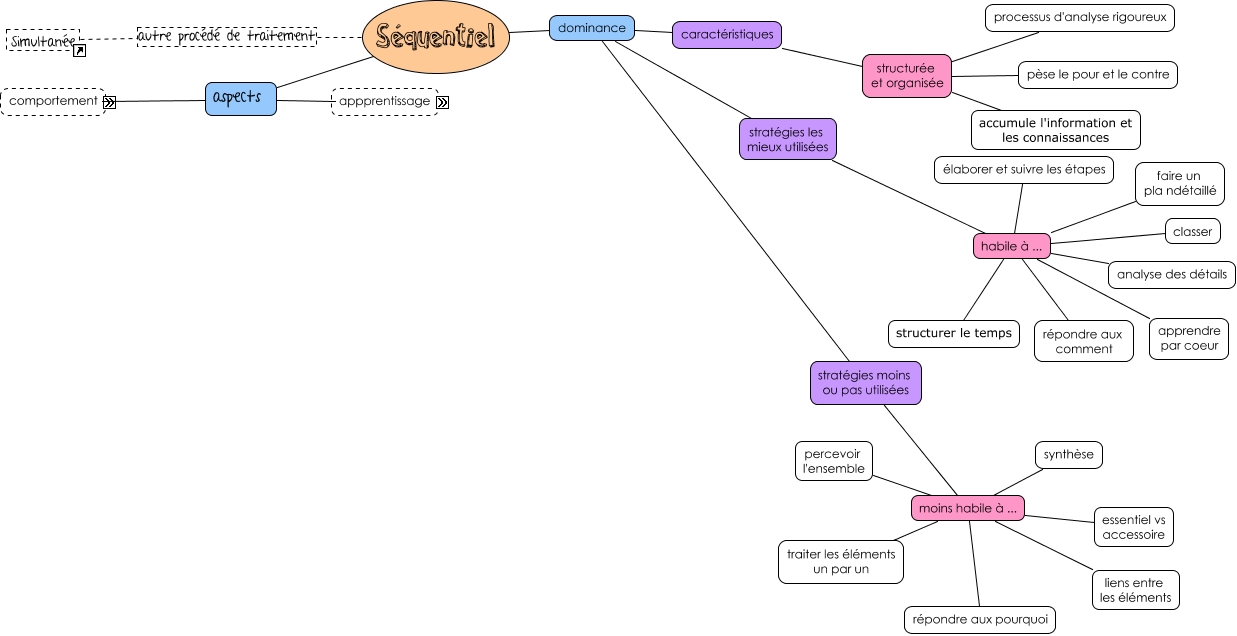 Cette carte de concepts créée avec IHMC CmapTools traite de: procédé de traitement - séquentiel, apprentissage apprendre par entraînement pensée secondaire, fonction d'analyse attention aux détails présentation, caractéristiques structurée et organisée accumule l'information et les connaissances, apprentissage apprendre par entraînement fonction d'analyse, stratégies les mieux utilisées habile à ... apprendre par coeur, pendant convergence besoin d'approbation, fonction d'analyse attention aux détails vise l'excellence, Séquentiel aspects apprentissage, concentration sur étape / échéancier démarche objectifs intermédiaires, stratégies les mieux utilisées habile à ... répondre aux comment, avant ordre formel et détaillé estime, fonction d'analyse attention aux détails arrivé à la fin = utilité ou futilité, stratégies les mieux utilisées habile à ... élaborer et suivre les étapes, attitude exécution de tâche après, stratégies moins ou pas utilisées moins habile à ... synthèse, attitude exécution de tâche pendant, Séquentiel aspects attitude, apprentissage apprendre par entraînement concentration sur étape / échéancier, stratégies moins ou pas utilisées moins habile à ... percevoir l'ensemble, fonction d'analyse attention aux détails suit précisement les étapes