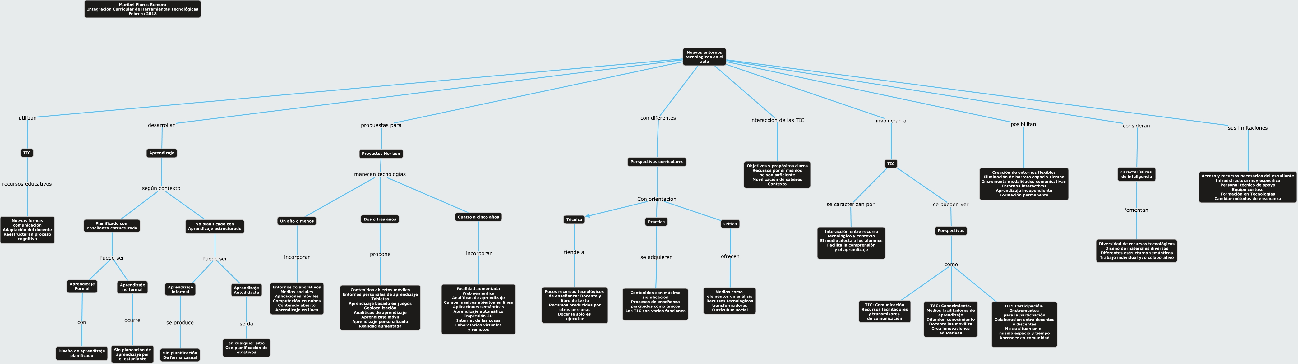 Este Cmap, tiene información relacionada con: Nuevos entornos tecnológicos, Perspectivas curriculares Con orientación Práctica, Proyectos Horizon manejan tecnologías Un año o menos, Nuevos entornos tecnológicos en el aula posibilitan Creación de entornos flexibles Eliminación de barrera espacio-tiempo Incrementa modalidades comunicativas Entornos interactivos Aprendizaje independiente Formación permanente, Nuevos entornos tecnológicos en el aula desarrollan Aprendizaje, Proyectos Horizon manejan tecnologías Dos o tres años, Perspectivas curriculares Con orientación Técnica, Nuevos entornos tecnológicos en el aula consideran Características de inteligencia, Aprendizaje Formal con Diseño de aprendizaje planificado, Cuatro a cinco años incorporar Realidad aumentada Web semántica Analíticas de aprendizaje Cursos masivos abiertos en línea Aplicaciones semánticas Aprendizaje automático Impresión 3D Internet de las cosas Laboratorios virtuales y remotos, Nuevos entornos tecnológicos en el aula utilizan TIC, Nuevos entornos tecnológicos en el aula propuestas para Proyectos Horizon, Aprendizaje no formal ocurre Sin planeación de aprendizaje por el estudiante, Un año o menos incorporar Entornos colaborativos Medios sociales Aplicaciones móviles Computación en nubes Contenido abierto Aprendizaje en línea, Dos o tres años propone Contenidos abiertos móviles Entornos personales de aprendizaje Tabletas Aprendizaje basado en juegos Geolocalización Analíticas de aprendizaje Aprendizaje móvil Aprendizaje personalizado Realidad aumentada, Proyectos Horizon manejan tecnologías Cuatro a cinco años, Aprendizaje informal se produce Sin planificación De forma casual, Aprendizaje Autodidacta se da en cualquier sitio Con planificación de objetivos, No planificado con Aprendizaje estructurado Puede ser Aprendizaje informal, Crítica ofrecen Medios como elementos de análisis Recursos tecnológicos transformadores Currículum social, Aprendizaje según contexto No planificado con Aprendizaje estructurado