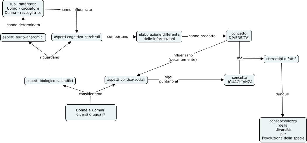 Questa Cmap, creata con IHMC CmapTools, contiene informazioni relative a: Uomini e donne_0, aspetti biologico-scientifici riguardano aspetti fisico-anatomici, concetto UGUAGLIANZA ma stereotipi o fatti?, aspetti fisico-anatomici hanno determinato ruoli differenti: Uomo - cacciatore Donna - raccoglitrice, Donne e Uomini: diversi o uguali? consideriamo aspetti politico-sociali, aspetti cognitivo-cerebrali comportano elaborazione differente delle informazioni, ruoli differenti: Uomo - cacciatore Donna - raccoglitrice hanno influenzato aspetti cognitivo-cerebrali, stereotipi o fatti? dunque consapevolezza della diversità per l'evoluzione della specie, aspetti politico-sociali oggi puntano al concetto UGUAGLIANZA, concetto DIVERSITA' influenzano (pesantemente) aspetti politico-sociali, aspetti biologico-scientifici riguardano aspetti cognitivo-cerebrali, concetto DIVERSITA' ma stereotipi o fatti?, Donne e Uomini: diversi o uguali? consideriamo aspetti biologico-scientifici, elaborazione differente delle informazioni hanno prodotto concetto DIVERSITA'