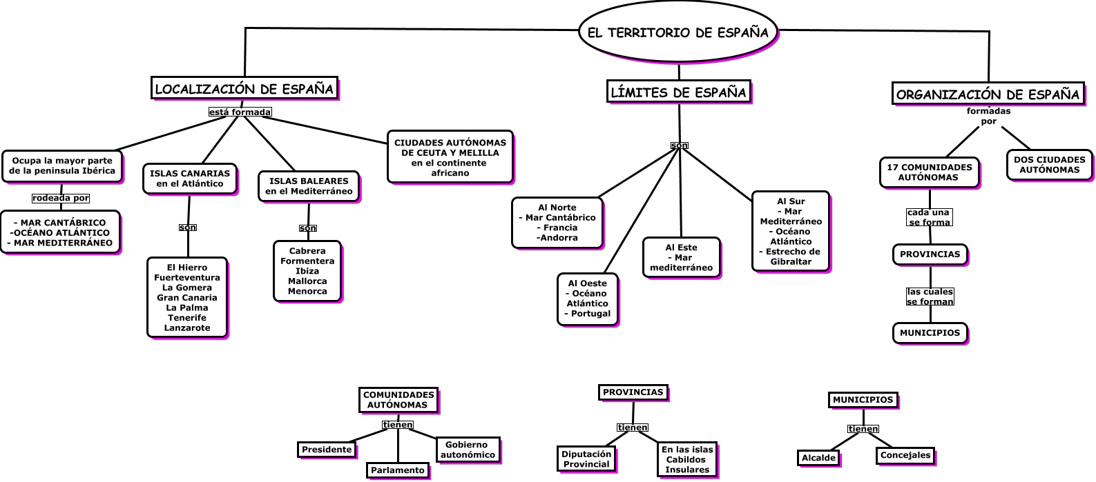 Este Cmap, tiene información relacionada con: EL TERRITORIO DE ESPAÑA, LOCALIZACIÓN DE ESPAÑA está formada ISLAS BALEARES en el Mediterráneo, LÍMITES DE ESPAÑA son Al Sur - Mar Mediterráneo - Océano Atlántico - Estrecho de Gibraltar, COMUNIDADES AUTÓNOMAS tienen Parlamento, COMUNIDADES AUTÓNOMAS tienen Presidente, LÍMITES DE ESPAÑA son Al Oeste - Océano Atlántico - Portugal, ISLAS CANARIAS en el Atlántico son El Hierro Fuerteventura La Gomera Gran Canaria La Palma Tenerife Lanzarote, Ocupa la mayor parte de la peninsula Ibérica rodeada por - MAR CANTÁBRICO -OCÉANO ATLÁNTICO - MAR MEDITERRÁNEO, EL TERRITORIO DE ESPAÑA ???? LOCALIZACIÓN DE ESPAÑA, LOCALIZACIÓN DE ESPAÑA está formada CIUDADES AUTÓNOMAS DE CEUTA Y MELILLA en el continente africano, COMUNIDADES AUTÓNOMAS tienen Gobierno autonómico, ISLAS BALEARES en el Mediterráneo son Cabrera Formentera Ibiza Mallorca Menorca, ORGANIZACIÓN DE ESPAÑA formadas por 17 COMUNIDADES AUTÓNOMAS, PROVINCIAS tienen Diputación Provincial, EL TERRITORIO DE ESPAÑA ???? ORGANIZACIÓN DE ESPAÑA, EL TERRITORIO DE ESPAÑA ???? LÍMITES DE ESPAÑA, LOCALIZACIÓN DE ESPAÑA está formada ISLAS CANARIAS en el Atlántico, PROVINCIAS las cuales se forman MUNICIPIOS, LOCALIZACIÓN DE ESPAÑA está formada Ocupa la mayor parte de la peninsula Ibérica, MUNICIPIOS tienen Alcalde, LÍMITES DE ESPAÑA son Al Norte - Mar Cantábrico - Francia -Andorra