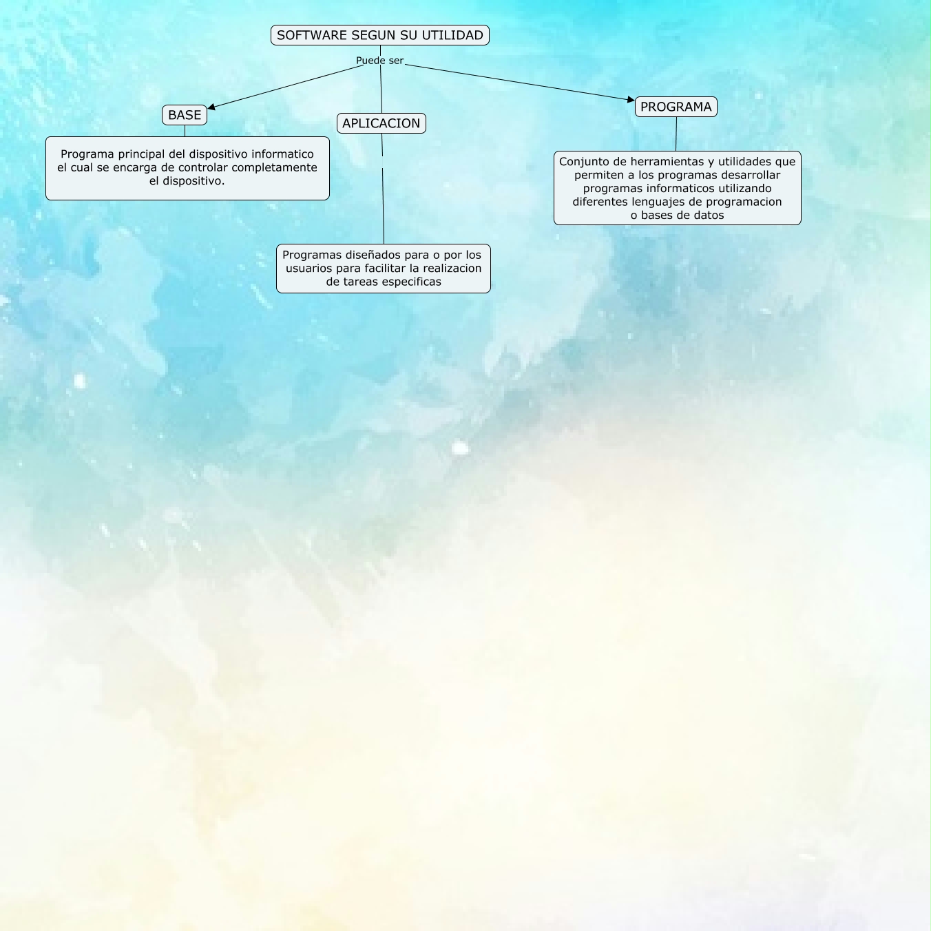 Este Cmap, tiene información relacionada con: sin titruko+}, BASE ???? Programa principal del dispositivo informatico el cual se encarga de controlar completamente el dispositivo., PROGRAMA ???? Conjunto de herramientas y utilidades que permiten a los programas desarrollar programas informaticos utilizando diferentes lenguajes de programacion o bases de datos, SOFTWARE SEGUN SU UTILIDAD Puede ser BASE, APLICACION Programas diseñados para o por los usuarios para facilitar la realizacion de tareas especificas, SOFTWARE SEGUN SU UTILIDAD Puede ser APLICACION, SOFTWARE SEGUN SU UTILIDAD Puede ser PROGRAMA