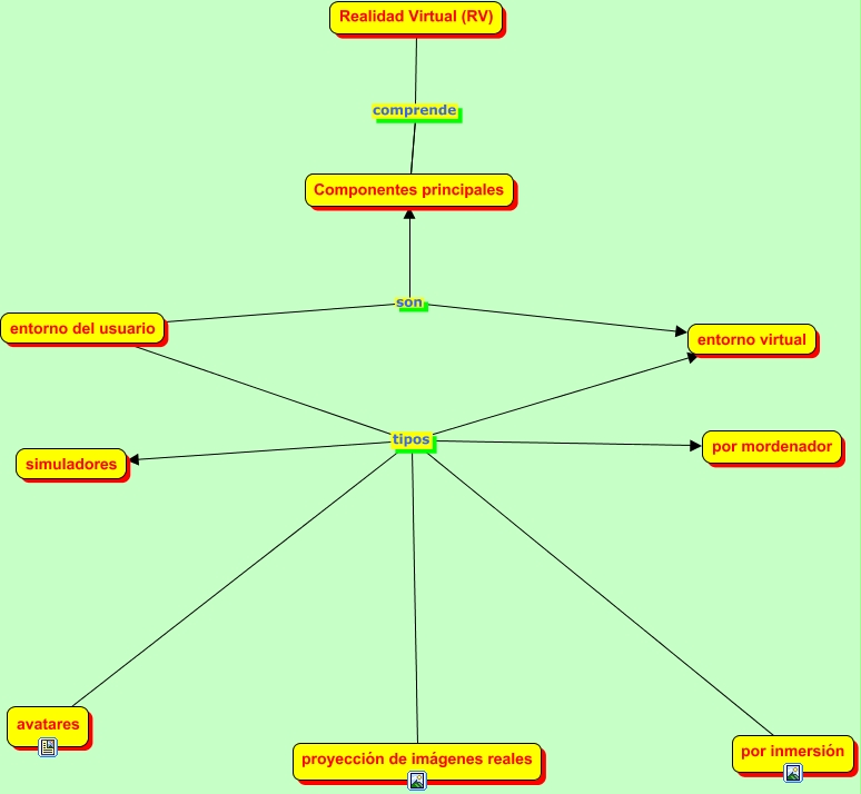Este Cmap, tiene información relacionada con: Realidad Virtual, entorno del usuario tipos entorno virtual, entorno del usuario tipos avatares, entorno del usuario son Componentes principales, entorno del usuario tipos por mordenador, entorno del usuario son entorno virtual, entorno del usuario tipos proyección de imágenes reales, Realidad Virtual (RV) comprende Componentes principales, entorno del usuario tipos simuladores, Realidad Virtual (RV) comprende Componentes principales, entorno del usuario tipos por inmersión