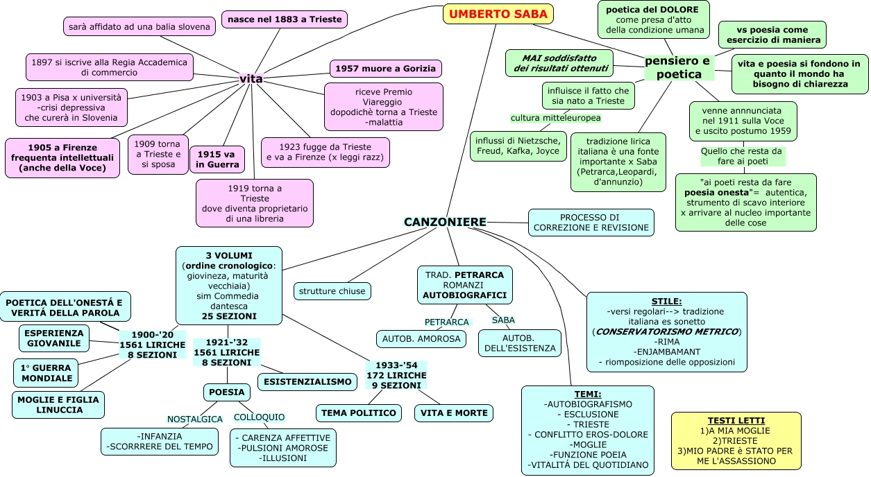 Questa Cmap, creata con IHMC CmapTools, contiene informazioni relative a: SABA VITA, POETICA,CANZONIERE, UMBERTO SABA vita 1923 fugge da Trieste e va a Firenze (x leggi razz), UMBERTO SABA vita 1897 si iscrive alla Regia Accademica di commercio, 3 VOLUMI (ordine cronologico: giovineza, maturità vecchiaia) sim Commedia dantesca 25 SEZIONI 1933-'54 172 LIRICHE 9 SEZIONI TEMA POLITICO, UMBERTO SABA pensiero e poetica venne annnunciata nel 1911 sulla Voce e uscito postumo 1959, 3 VOLUMI (ordine cronologico: giovineza, maturità vecchiaia) sim Commedia dantesca 25 SEZIONI 1900-'20 1561 LIRICHE 8 SEZIONI POETICA DELL'ONESTÁ E VERITÁ DELLA PAROLA, UMBERTO SABA pensiero e poetica vita e poesia si fondono in quanto il mondo ha bisogno di chiarezza, TRAD. PETRARCA ROMANZI AUTOBIOGRAFICI PETRARCA AUTOB. AMOROSA, UMBERTO SABA CANZONIERE 3 VOLUMI (ordine cronologico: giovineza, maturità vecchiaia) sim Commedia dantesca 25 SEZIONI, 3 VOLUMI (ordine cronologico: giovineza, maturità vecchiaia) sim Commedia dantesca 25 SEZIONI 1900-'20 1561 LIRICHE 8 SEZIONI POETICA DELL'ONESTÁ E VERITÁ DELLA PAROLA, UMBERTO SABA vita 1909 torna a Trieste e si sposa, 3 VOLUMI (ordine cronologico: giovineza, maturità vecchiaia) sim Commedia dantesca 25 SEZIONI 1900-'20 1561 LIRICHE 8 SEZIONI MOGLIE E FIGLIA LINUCCIA, UMBERTO SABA vita 1903 a Pisa x università -crisi depressiva che curerà in Slovenia, venne annnunciata nel 1911 sulla Voce e uscito postumo 1959 Quello che resta da fare ai poeti "ai poeti resta da fare poesia onesta"= autentica, strumento di scavo interiore x arrivare al nucleo importante delle cose, 3 VOLUMI (ordine cronologico: giovineza, maturità vecchiaia) sim Commedia dantesca 25 SEZIONI 1900-'20 1561 LIRICHE 8 SEZIONI 1° GUERRA MONDIALE, UMBERTO SABA vita nasce nel 1883 a Trieste, POESIA COLLOQUIO - CARENZA AFFETTIVE -PULSIONI AMOROSE -ILLUSIONI, UMBERTO SABA CANZONIERE strutture chiuse, UMBERTO SABA CANZONIERE TRAD. PETRARCA ROMANZI AUTOBIOGRAFICI, UMBERTO SABA CANZONIERE PROCESSO DI CORREZIONE E REVISIONE, UMBERTO SABA pensiero e poetica vs poesia come esercizio di maniera