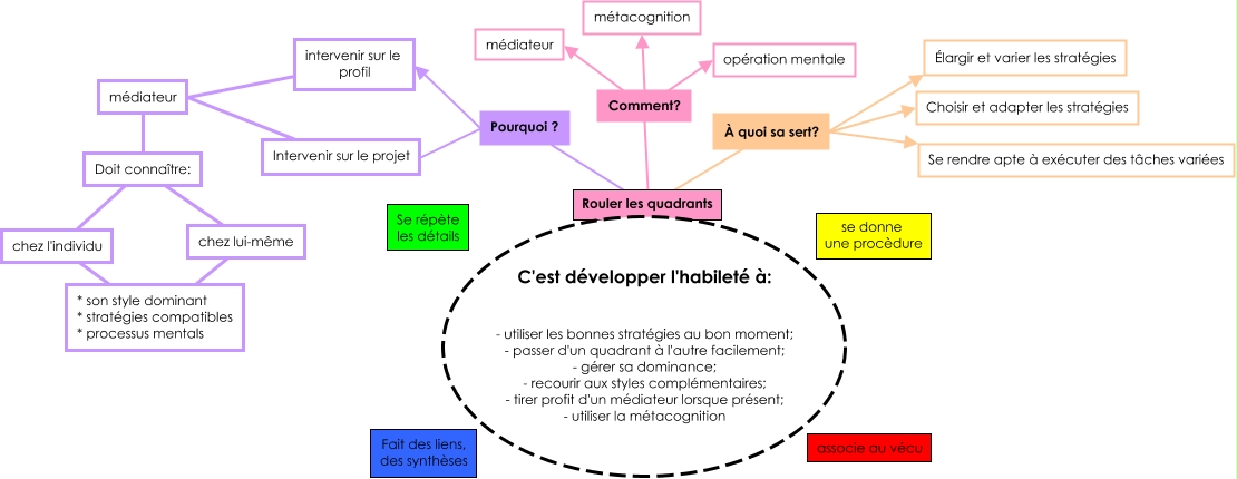 Cette carte de concepts créée avec IHMC CmapTools traite de: Rouler les quadrants, Rouler les quadrants À quoi sa sert? Se rendre apte à exécuter des tâches variées, Rouler les quadrants Pourquoi ? Intervenir sur le projet, Rouler les quadrants À quoi sa sert? Élargir et varier les stratégies, Rouler les quadrants Pourquoi ? intervenir sur le profil, intervenir sur le profil médiateur Doit connaître:, Rouler les quadrants Comment? opération mentale, Rouler les quadrants Comment? médiateur, Doit connaître: chez lui-même * son style dominant * stratégies compatibles * processus mentals, Doit connaître: chez l'individu * son style dominant * stratégies compatibles * processus mentals, intervenir sur le profil médiateur Intervenir sur le projet, Rouler les quadrants Comment? métacognition, Rouler les quadrants À quoi sa sert? Choisir et adapter les stratégies