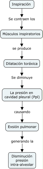 Este Cmap, tiene información relacionada con: Inspiración, Músculos inspiratorios se produce Dilatación toráxica, Exsión pulmonar generando la Disminución presión intra-alveolar, Dilatación toráxica Se diminuye La presión en cavidad pleural (Ppl), Inspiración Se contraen los Músculos inspiratorios, La presión en cavidad pleural (Ppl) causando Exsión pulmonar