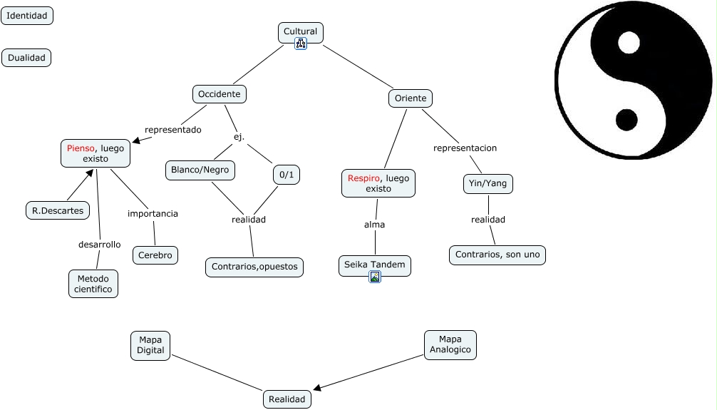 Este Cmap, tiene información relacionada con: Dualidad Cultural, Blanco/Negro realidad Contrarios,opuestos, Pienso, luego existo importancia Cerebro, Oriente representacion Yin/Yang, Occidente ej. Blanco/Negro, Cultural Occidente, Mapa Digital Realidad, Yin/Yang realidad Contrarios, son uno, Pienso, luego existo desarrollo Metodo cientifico, Respiro, luego existo alma Seika Tandem, Mapa Analogico Realidad, Occidente representado Pienso, luego existo, 0/1 realidad Contrarios,opuestos, Oriente Respiro, luego existo, Occidente ej. 0/1, Cultural Oriente, R.Descartes Pienso, luego existo
