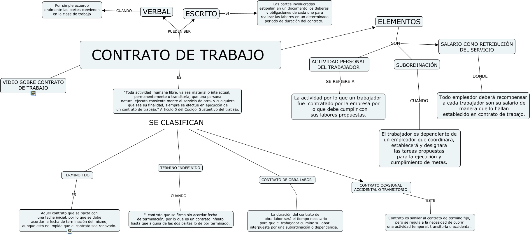 Este Cmap, tiene información relacionada con: CONTRATO DE TRABAJO, ACTIVIDAD PERSONAL DEL TRABAJADOR SE REFIERE A La actividad por lo que un trabajador fue contratado por la empresa por lo que debe cumplir con sus labores propuestas., VERBAL CUANDO Por simple acuerdo oralmente las partes convienen en la clase de trabajo, SUBORDINACIÓN CUANDO El trabajador es dependiente de un empleador que coordinara, establecerá y designara las tareas propuestas para la ejecución y cumplimiento de metas., CONTRATO DE TRABAJO ???? ELEMENTOS, CONTRATO DE TRABAJO PUEDEN SER ESCRITO, CONTRATO OCASIONAL ACCIDENTAL O TRANSITORIO ESTE Contrato es similar al contrato de termino fijo, pero se regula a la necesidad de cubrir una actividad temporal, transitoria o accidental., ESCRITO SI Las partes involucradas estipulan en un documento los deberes y obligaciones de cada uno para realizar las labores en un determinado periodo de duración del contrato., SALARIO COMO RETRIBUCIÓN DEL SERVICIO DONDE Todo empleador deberá recompensar a cada trabajador son su salario de manera que lo hallan establecido en contrato de trabajo., "Toda actividad humana libre, ya sea material o intelectual, permanentemente o transitoria, que una persona natural ejecuta consiente mente al servicio de otra, y cualquiera que sea su finalidad, siempre se efectúe en ejecución de un contrato de trabajo." Articulo 5 del Código Sustantivo del trabajo. SE CLASIFICAN TERMINO INDEFINIDO, "Toda actividad humana libre, ya sea material o intelectual, permanentemente o transitoria, que una persona natural ejecuta consiente mente al servicio de otra, y cualquiera que sea su finalidad, siempre se efectúe en ejecución de un contrato de trabajo." Articulo 5 del Código Sustantivo del trabajo. SE CLASIFICAN CONTRATO OCASIONAL ACCIDENTAL O TRANSITORIO, ELEMENTOS SON ACTIVIDAD PERSONAL DEL TRABAJADOR, CONTRATO DE TRABAJO ???? VIDEO SOBRE CONTRATO DE TRABAJO, CONTRATO DE TRABAJO PUEDEN SER VERBAL, TERMINO FIJO ES Aquel contrato que se pacta con una fecha inicial, por lo que se debe acordar la fecha de terminación del mismo, aunque esto no impide que el contrato sea renovado., "Toda actividad humana libre, ya sea material o intelectual, permanentemente o transitoria, que una persona natural ejecuta consiente mente al servicio de otra, y cualquiera que sea su finalidad, siempre se efectúe en ejecución de un contrato de trabajo." Articulo 5 del Código Sustantivo del trabajo. SE CLASIFICAN TERMINO FIJO, ELEMENTOS SON SALARIO COMO RETRIBUCIÓN DEL SERVICIO, TERMINO INDEFINIDO CUANDO El contrato que se firma sin acordar fecha de terminación, por lo que es un contrato infinito hasta que alguna de las dos partes lo de por terminado., ELEMENTOS SON SUBORDINACIÓN, CONTRATO DE TRABAJO ES "Toda actividad humana libre, ya sea material o intelectual, permanentemente o transitoria, que una persona natural ejecuta consiente mente al servicio de otra, y cualquiera que sea su finalidad, siempre se efectúe en ejecución de un contrato de trabajo." Articulo 5 del Código Sustantivo del trabajo., CONTRATO DE OBRA LABOR SI La duración del contrato de obra labor será el tiempo necesario para que el trabajador culmine su labor interpuesta por una subordinación o dependencia.
