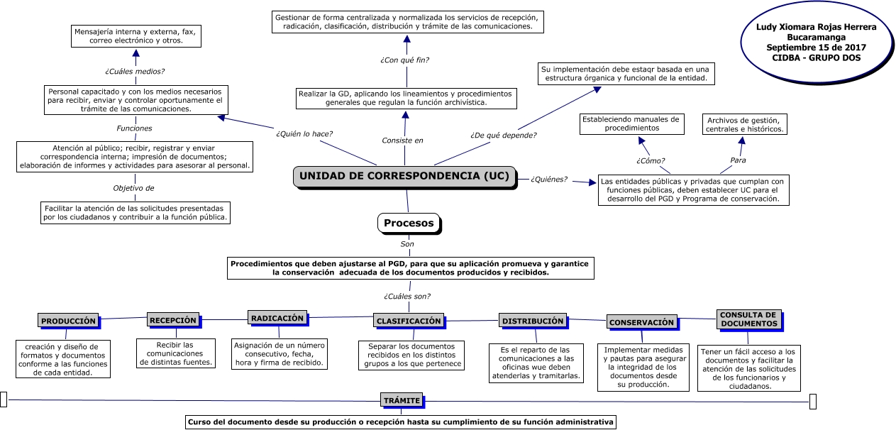 Este Cmap, tiene información relacionada con: Unidad de Correspondencia-GD, Es el reparto de las comunicaciones a las oficinas wue deben atenderlas y tramitarlas. ???? DISTRIBUCIÓN, RECEPCIÓN ???? Recibir las comunicaciones de distintas fuentes., Procesos Son Procedimientos que deben ajustarse al PGD, para que su aplicación promueva y garantice la conservación adecuada de los documentos producidos y recibidos., CONSERVACIÓN ???? CONSULTA DE DOCUMENTOS, Atención al público; recibir, registrar y enviar correspondencia interna; impresión de documentos; elaboración de informes y actividades para asesorar al personal. Objetivo de Facilitar la atención de las solicitudes presentadas por los ciudadanos y contribuir a la función pública., Las entidades públicas y privadas que cumplan con funciones públicas, deben establecer UC para el desarrollo del PGD y Programa de conservación. ¿Cómo? Estableciendo manuales de procedimientos, Procedimientos que deben ajustarse al PGD, para que su aplicación promueva y garantice la conservación adecuada de los documentos producidos y recibidos. ¿Cuáles son? CLASIFICACIÓN, Las entidades públicas y privadas que cumplan con funciones públicas, deben establecer UC para el desarrollo del PGD y Programa de conservación. Para Archivos de gestión, centrales e históricos., Es el reparto de las comunicaciones a las oficinas wue deben atenderlas y tramitarlas. ???? DISTRIBUCIÓN, RECEPCIÓN ???? PRODUCCIÓN, Realizar la GD, aplicando los lineamientos y procedimientos generales que regulan la función archivística. ¿Con qué fin? Gestionar de forma centralizada y normalizada los servicios de recepción, radicación, clasificación, distribución y trámite de las comunicaciones., UNIDAD DE CORRESPONDENCIA (UC) Consiste en Realizar la GD, aplicando los lineamientos y procedimientos generales que regulan la función archivística., UNIDAD DE CORRESPONDENCIA (UC) ¿Quiénes? Las entidades públicas y privadas que cumplan con funciones públicas, deben establecer UC para el desarrollo del PGD y Programa de conservación., UNIDAD DE CORRESPONDENCIA (UC) ¿Quién lo hace? Personal capacitado y con los medios necesarios para recibir, enviar y controlar oportunamente el trámite de las comunicaciones., Personal capacitado y con los medios necesarios para recibir, enviar y controlar oportunamente el trámite de las comunicaciones. ¿Cuáles medios? Mensajería interna y externa, fax, correo electrónico y otros., RADICACIÓN ???? RECEPCIÓN, RADICACIÓN ???? Asignación de un número consecutivo, fecha, hora y firma de recibido., CLASIFICACIÓN ???? Separar los documentos recibidos en los distintos grupos a los que pertenece, UNIDAD DE CORRESPONDENCIA (UC) ¿De qué depende? Su implementación debe estaqr basada en una estructura órganica y funcional de la entidad., Implementar medidas y pautas para asegurar la integridad de los documentos desde su producción. ???? CONSERVACIÓN