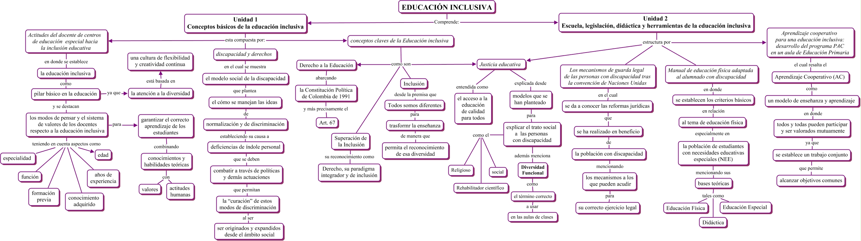 Este Cmap, tiene información relacionada con: Educación Inclusiva, los modos de pensar y el sistema de valores de los docentes respecto a la educación inclusiva teniendo en cuenta aspectos como años de experiencia, conceptos claves de la Educación inclusiva como son Superación de la Inclusión, Unidad 1 Conceptos básicos de la educación inclusiva esta compuesta por: Actitudes del docente de centros de educación especial hacia la inclusión educativa, Unidad 2 Escuela, legislación, didáctica y herramientas de la educación inclusiva estructura por Aprendizaje cooperativo para una educación inclusiva: desarrollo del programa PAC en un aula de Educación Primaria, bases teóricas tales como Educación Física, la población con discapacidad mencionando los mecanismos a los que pueden acudir, un modelo de enseñanza y aprendizaje en donde todos y todas pueden participar y ser valorados mutuamente, combatir a través de políticas y demás actuaciones que permitan la “curación” de estos modos de discriminación, Unidad 2 Escuela, legislación, didáctica y herramientas de la educación inclusiva estructura por Justicia educativa, Unidad 1 Conceptos básicos de la educación inclusiva esta compuesta por: discapacidad y derechos, bases teóricas tales como Didáctica, Justicia educativa explicada desde modelos que se han planteado, Diversidad Funcional como el término correcto, conocimientos y habilidades teóricas con actitudes humanas, Derecho a la Educación abarcando la Constitución Política de Colombia de 1991, los modos de pensar y el sistema de valores de los docentes respecto a la educación inclusiva teniendo en cuenta aspectos como especialidad, deficiencias de índole personal que se deben combatir a través de políticas y demás actuaciones, la población de estudiantes con necesidades educativas especiales (NEE) mencionando sus bases teóricas, los modos de pensar y el sistema de valores de los docentes respecto a la educación inclusiva teniendo en cuenta aspectos como conocimiento adquirido, los modos de pensar y el sistema de valores de los docentes respecto a la educación inclusiva para garantizar el correcto aprendizaje de los estudiantes