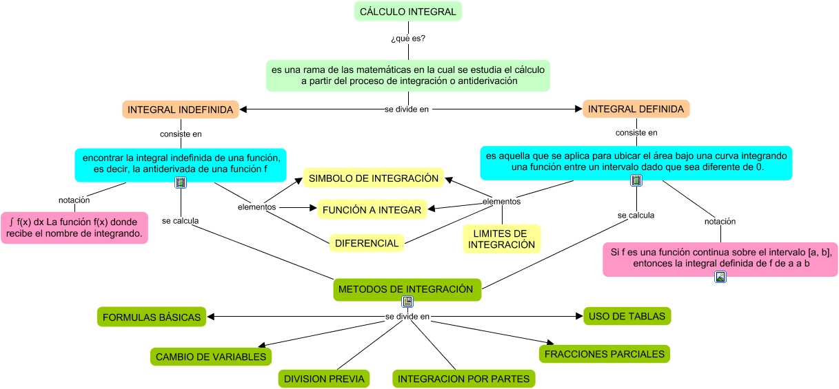 Este Cmap, tiene información relacionada con: MAPA CALCULO INTEGRAL, METODOS DE INTEGRACIÓN se divide en CAMBIO DE VARIABLES, encontrar la integral indefinida de una función, es decir, la antiderivada de una función f se calcula METODOS DE INTEGRACIÓN, encontrar la integral indefinida de una función, es decir, la antiderivada de una función f notación ∫ f(x) dx La función f(x) donde recibe el nombre de integrando., METODOS DE INTEGRACIÓN se divide en FORMULAS BÁSICAS, METODOS DE INTEGRACIÓN se divide en INTEGRACION POR PARTES, es aquella que se aplica para ubicar el área bajo una curva integrando una función entre un intervalo dado que sea diferente de 0. elementos DIFERENCIAL, INTEGRAL INDEFINIDA consiste en encontrar la integral indefinida de una función, es decir, la antiderivada de una función f, METODOS DE INTEGRACIÓN se divide en FRACCIONES PARCIALES, INTEGRAL DEFINIDA consiste en es aquella que se aplica para ubicar el área bajo una curva integrando una función entre un intervalo dado que sea diferente de 0., es aquella que se aplica para ubicar el área bajo una curva integrando una función entre un intervalo dado que sea diferente de 0. elementos LIMITES DE INTEGRACIÓN, METODOS DE INTEGRACIÓN se divide en DIVISION PREVIA, es una rama de las matemáticas en la cual se estudia el cálculo a partir del proceso de integración o antiderivación se divide en INTEGRAL DEFINIDA, es aquella que se aplica para ubicar el área bajo una curva integrando una función entre un intervalo dado que sea diferente de 0. notación Si f es una función continua sobre el intervalo [a, b], entonces la integral definida de f de a a b, encontrar la integral indefinida de una función, es decir, la antiderivada de una función f elementos FUNCIÓN A INTEGAR, es aquella que se aplica para ubicar el área bajo una curva integrando una función entre un intervalo dado que sea diferente de 0. elementos SIMBOLO DE INTEGRACIÓN, METODOS DE INTEGRACIÓN se divide en USO DE TABLAS, es aquella que se aplica para ubicar el área bajo una curva integrando una función entre un intervalo dado que sea diferente de 0. se calcula METODOS DE INTEGRACIÓN, CÁLCULO INTEGRAL ¿qué es? es una rama de las matemáticas en la cual se estudia el cálculo a partir del proceso de integración o antiderivación, encontrar la integral indefinida de una función, es decir, la antiderivada de una función f elementos DIFERENCIAL, es aquella que se aplica para ubicar el área bajo una curva integrando una función entre un intervalo dado que sea diferente de 0. elementos FUNCIÓN A INTEGAR