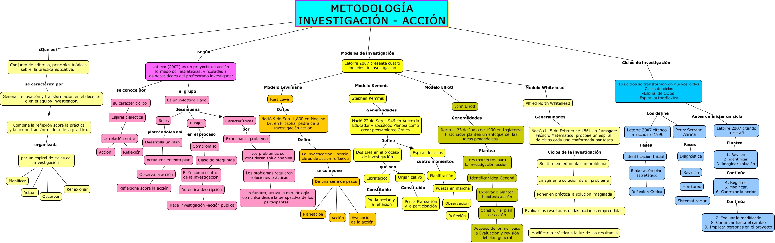 Este Cmap, tiene información relacionada con: Mapa Conceptual del proceso, modelos y ciclos de la investigación - acción, Imaginar la solución de un problema ???? Poner en práctica la solución imaginada, Identificación Inicial ???? Elaboración plan estratégico, 4. Registrar 5. Modificar. 6. Controlar la acción Continúa 7. Evaluar lo modificado 8. Continuar hasta el cambio 9. Implicar personas en el proyecto, Poner en práctica la solución imaginada ???? Evaluar los resultados de las acciones emprendidas, Latorre 2007 presenta cuatro modelos de investigación Modelo Lewiniano Kurt Lewin, Rasgos en el proceso Compromiso, Desarrolla un plan ???? Actúa implementa plan, Nació 22 de Sep. 1946 en Australia Educador y sociólogo Plantea como crear pensamiento Crítico Define Espiral de ciclos, Nació 22 de Sep. 1946 en Australia Educador y sociólogo Plantea como crear pensamiento Crítico Define Dos Ejes en el proceso de investigación, Auténtica descripción ???? Hace investigación -acción pública, Es un colectivo clave desempeña Características, por un espiral de ciclos de investigación ???? Reflexionar, Generar renovación y transformación en el docente o en el equipo investigador. y Combina la reflexión sobre la práctica y la acción transformadora de la practica., Dos Ejes en el proceso de investigación que son Organizativo, METODOLOGÍA INVESTIGACIÓN - ACCIÓN Ciclos de investigación -Los ciclos se transforman en nuevos ciclos -Ciclos de ciclos -Espiral de ciclos -Espiral autoreflexiva, La relación entre ???? Acción, Latorre 2007 citando a Escudero 1990 Fases Identificación Inicial, Actúa implementa plan ???? Observa la acción, METODOLOGÍA INVESTIGACIÓN - ACCIÓN ¿Qué es? Conjunto de criterios, principios teóricos sobre la práctica educativa., Organizativo Constituido Por la Planeación y la participación