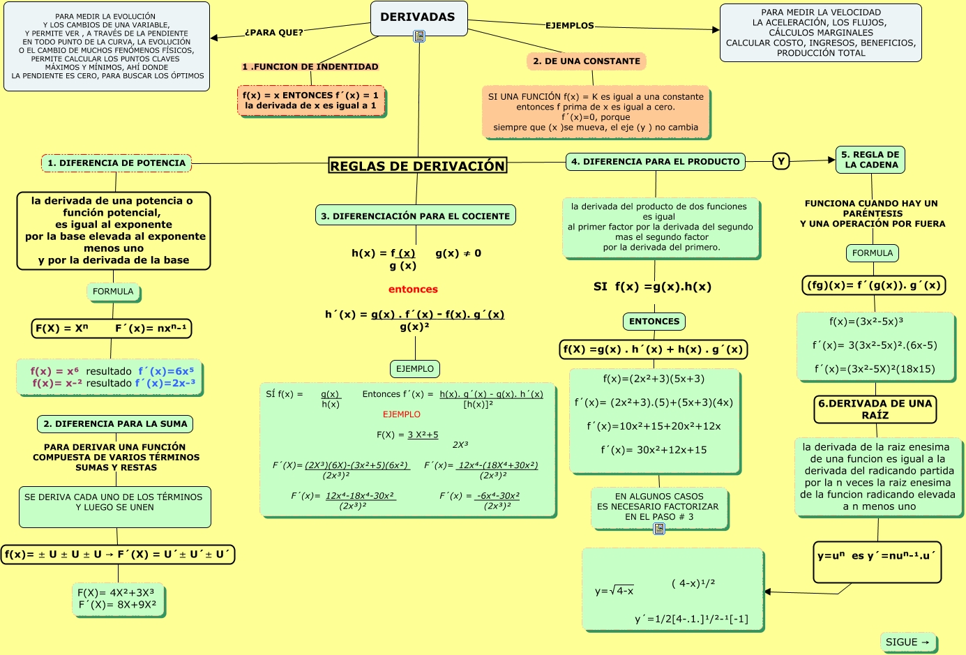 y´=1/2[4-.1.]¹/²-¹[-1] </mtext> <mtext> </mtext> </math>, FORMULA F(X) = Xⁿ F´(x)= nxⁿ-¹ f(x) = x⁶ resultado f´(x)=6x⁵ f(x)= x-² resultado f´(x)=2x-³, DERIVADAS 1 .FUNCION DE INDENTIDAD f(x) = x ENTONCES f´(x) = 1 la derivada de x es igual a 1, DERIVADAS REGLAS DE DERIVACIÓN 3. DIFERENCIACIÓN PARA EL COCIENTE, DERIVADAS ???? SI UNA FUNCIÓN f(x) = K es igual a una constante entonces f prima de x es igual a cero. f´(x)=0, porque siempre que (x )se mueva, el eje (y ) no cambia