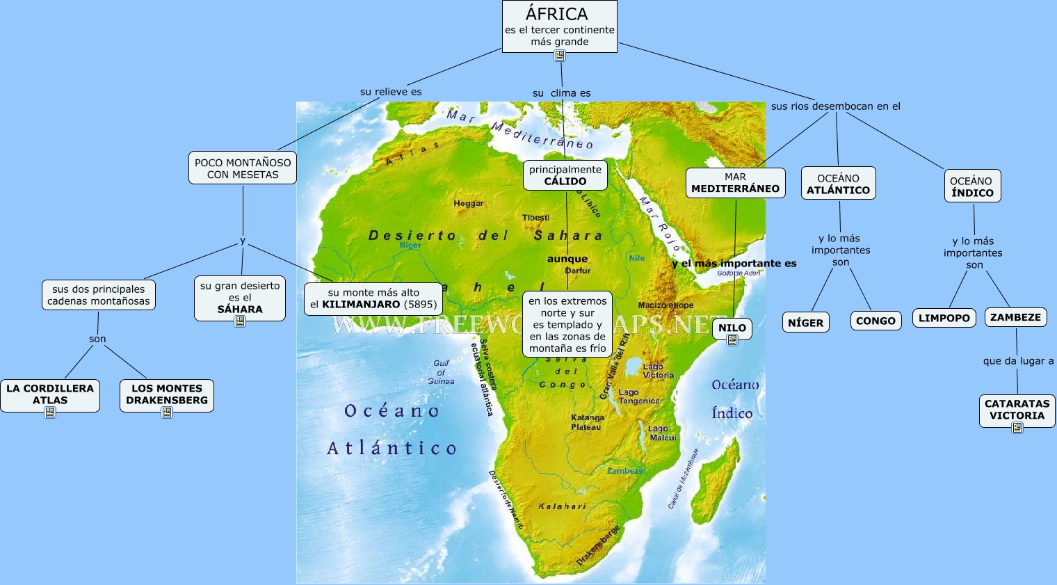 Este Cmap, tiene información relacionada con: �?FRICA, OCE�?NO ATL�?NTICO y lo más importantes son N�?GER, OCE�?NO ATL�?NTICO y lo más importantes son CONGO, OCE�?NO �?NDICO y lo más importantes son LIMPOPO, �?FRICA es el tercer continente más grande sus rios desembocan en el OCE�?NO �?NDICO, sus dos principales cadenas montañosas son LA CORDILLERA ATLAS, �?FRICA es el tercer continente más grande su clima es principalmente C�?LIDO, �?FRICA es el tercer continente más grande sus rios desembocan en el MAR MEDITERR�?NEO, POCO MONTAÑOSO CON MESETAS y su monte más alto el KILIMANJARO (5895), �?FRICA es el tercer continente más grande su relieve es POCO MONTAÑOSO CON MESETAS, sus dos principales cadenas montañosas son LOS MONTES DRAKENSBERG, POCO MONTAÑOSO CON MESETAS y su gran desierto es el S�?HARA, MAR MEDITERR�?NEO y el más importante es NILO, OCE�?NO �?NDICO y lo más importantes son ZAMBEZE, principalmente C�?LIDO aunque en los extremos norte y sur es templado y en las zonas de montaña es frío, �?FRICA es el tercer continente más grande sus rios desembocan en el OCE�?NO ATL�?NTICO, POCO MONTAÑOSO CON MESETAS y sus dos principales cadenas montañosas, ZAMBEZE que da lugar a CATARATAS VICTORIA