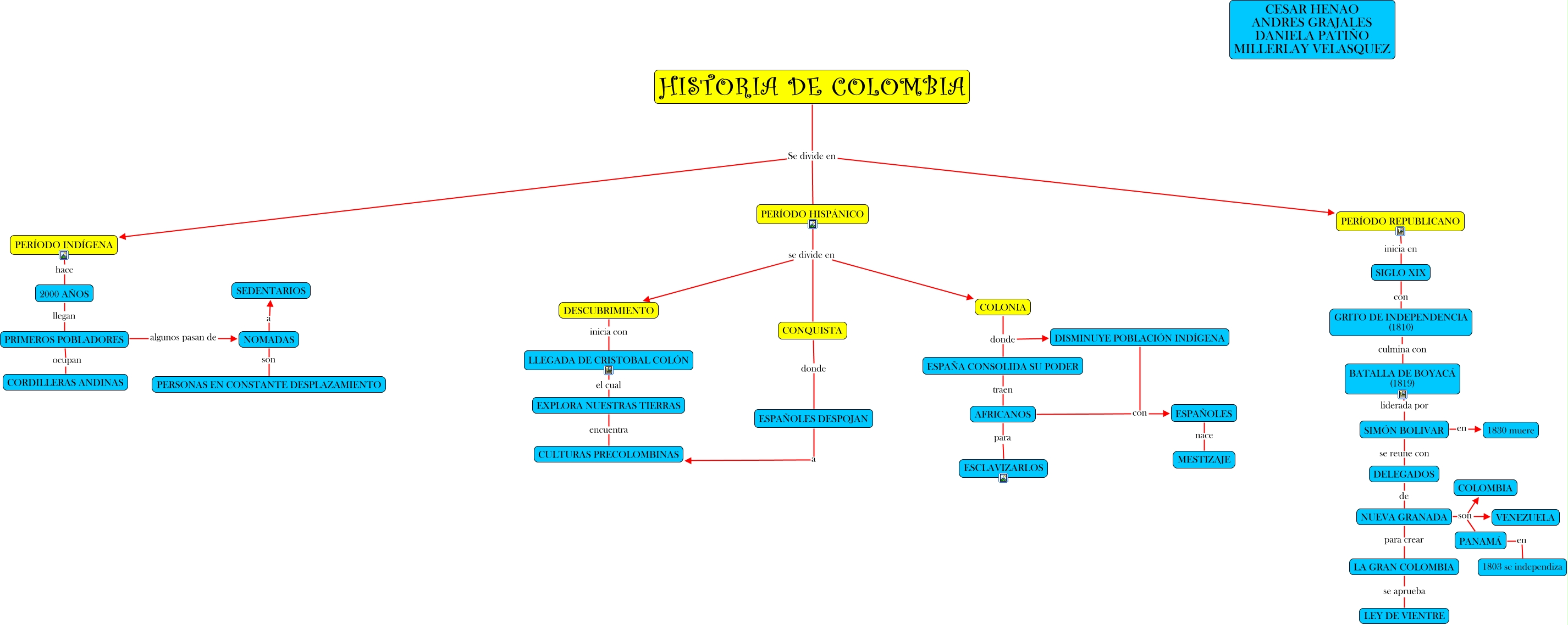 Este Cmap, tiene información relacionada con: historia de colombia, NUEVA GRANADA para crear LA GRAN COLOMBIA, COLONIA donde ESPAÑA CONSOLIDA SU PODER, LLEGADA DE CRISTOBAL COLÓN el cual EXPLORA NUESTRAS TIERRAS, PERÍODO HISPÁNICO se divide en DESCUBRIMIENTO, ESPAÑA CONSOLIDA SU PODER traen AFRICANOS, NUEVA GRANADA son PANAMÁ, CONQUISTA donde ESPAÑOLES DESPOJAN, DISMINUYE POBLACIÓN INDÍGENA con ESPAÑOLES, PRIMEROS POBLADORES ocupan CORDILLERAS ANDINAS, 2000 AÑOS llegan PRIMEROS POBLADORES, COLONIA donde DISMINUYE POBLACIÓN INDÍGENA, EXPLORA NUESTRAS TIERRAS encuentra CULTURAS PRECOLOMBINAS, AFRICANOS para ESCLAVIZARLOS, GRITO DE INDEPENDENCIA (1810) culmina con BATALLA DE BOYACÁ (1819), PERÍODO REPUBLICANO inicia en SIGLO XIX, ESPAÑOLES nace MESTIZAJE, NOMADAS a SEDENTARIOS, AFRICANOS con ESPAÑOLES, NOMADAS son PERSONAS EN CONSTANTE DESPLAZAMIENTO, DESCUBRIMIENTO inicia con LLEGADA DE CRISTOBAL COLÓN