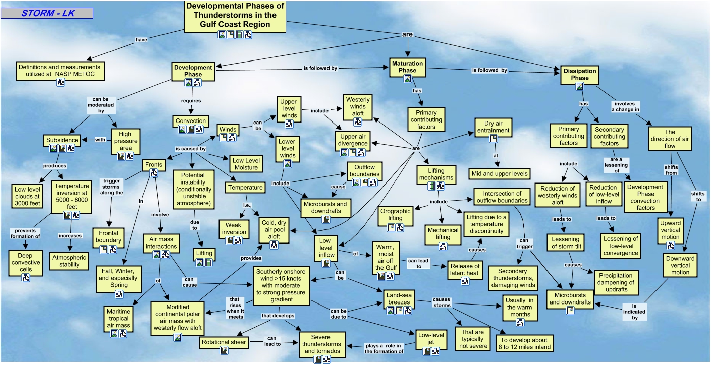 This Concept Map, created with IHMC CmapTools, has information related to: Developmental Phases of Thunderstorms in the Gulf Coast Region, Convection is caused by Fronts, Upper- level winds include Westerly winds aloft, Lower- level winds include Microbursts and downdrafts, Upper- level winds include Upper-air divergence, Southerly onshore wind ᡇ knots with moderate to strong pressure gradient can be due to Land-sea breezes, Convection is caused by Low Level Moisture, High pressure area with Subsidence, Dissipation Phase has Primary contributing factors, Winds can be Lower- level winds, Developmental Phases of Thunderstorms in the Gulf Coast Region are Development Phase, Development Phase can be moderated by Subsidence, Subsidence produces Temperature inversion at 5000 - 8000 feet, Lifting mechanisms include Mechanical lifting, Low- level inflow of Warm, moist air off the Gulf, Air mass interactions can cause Southerly onshore wind ᡇ knots with moderate to strong pressure gradient, Reduction of westerly winds aloft leads to Lessening of storm tilt, Potential instability (conditionally unstable atmosphere) due to Lifting, Air mass interactions of Modified continental polar air mass with westerly flow aloft, Low- level inflow can be Southerly onshore wind ᡇ knots with moderate to strong pressure gradient, Developmental Phases of Thunderstorms in the Gulf Coast Region are Maturation Phase