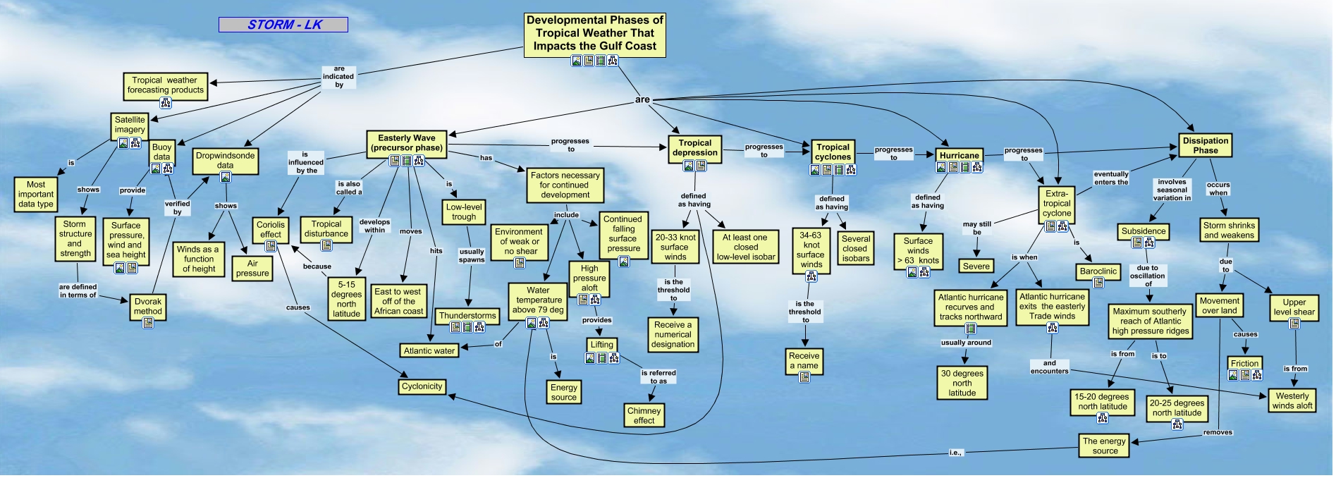 This Concept Map, created with IHMC CmapTools, has information related to: Developmental Phases of Tropical Weather That Impacts the Gulf Coast, Developmental Phases of Tropical Weather That Impacts the Gulf Coast are Easterly Wave (precursor phase), Extra- tropical cyclone may still be Severe, Tropical depression defined as having 20-33 knot surface winds, Dropwindsonde data shows Winds as a function of height, 5-15 degrees north latitude because Coriolis effect, Movement over land causes Friction, Satellite imagery shows Storm structure and strength, Developmental Phases of Tropical Weather That Impacts the Gulf Coast are Extra- tropical cyclone, High pressure aloft provides Lifting, 20-33 knot surface winds is the threshold to Receive a numerical designation, Easterly Wave (precursor phase) is influenced by the Coriolis effect, Developmental Phases of Tropical Weather That Impacts the Gulf Coast are Hurricane, Developmental Phases of Tropical Weather That Impacts the Gulf Coast are indicated by Satellite imagery, Tropical cyclones progresses to Hurricane, Dvorak method verified by Dropwindsonde data, Atlantic hurricane recurves and tracks northward usually around 30 degrees north latitude, Coriolis effect causes Cyclonicity, Tropical cyclones defined as having Several closed isobars, Extra- tropical cyclone is when Atlantic hurricane recurves and tracks northward, Tropical depression defined as having At least one closed low-level isobar