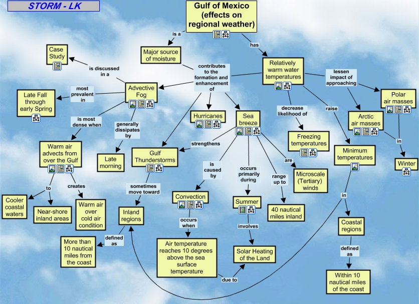 This Concept Map, created with IHMC CmapTools, has information related to: Gulf of Mexico Effects, Advective Fog is most dense when Warm air advects from over the Gulf, Sea breeze is caused by Convection, Sea breeze are Microscale (Tertiary) winds, Warm air advects from over the Gulf to Near-shore inland areas, Arctic air masses in Winter, Relatively warm water temperatures contributes to the formation and enhancement of Sea breeze, Advective Fog is discussed in a Case Study, Relatively warm water temperatures decrease likelihood of Freezing temperatures, Relatively warm water temperatures contributes to the formation and enhancement of Hurricanes, Polar air masses in Winter, Gulf of Mexico (effects on regional weather) is a Major source of moisture, Advective Fog generally dissipates by Late morning, Relatively warm water temperatures lessen impact of approaching Arctic air masses, Major source of moisture contributes to the formation and enhancement of Advective Fog, Advective Fog most prevalent in Late Fall through early Spring, Coastal regions defined as Within 10 nautical miles of the coast, Summer involves Solar Heating of the Land, Warm air advects from over the Gulf creates Warm air over cold air condition, Air temperature reaches 10 degrees above the sea surface temperature due to Solar Heating of the Land, Sea breeze range up to 40 nautical miles inland