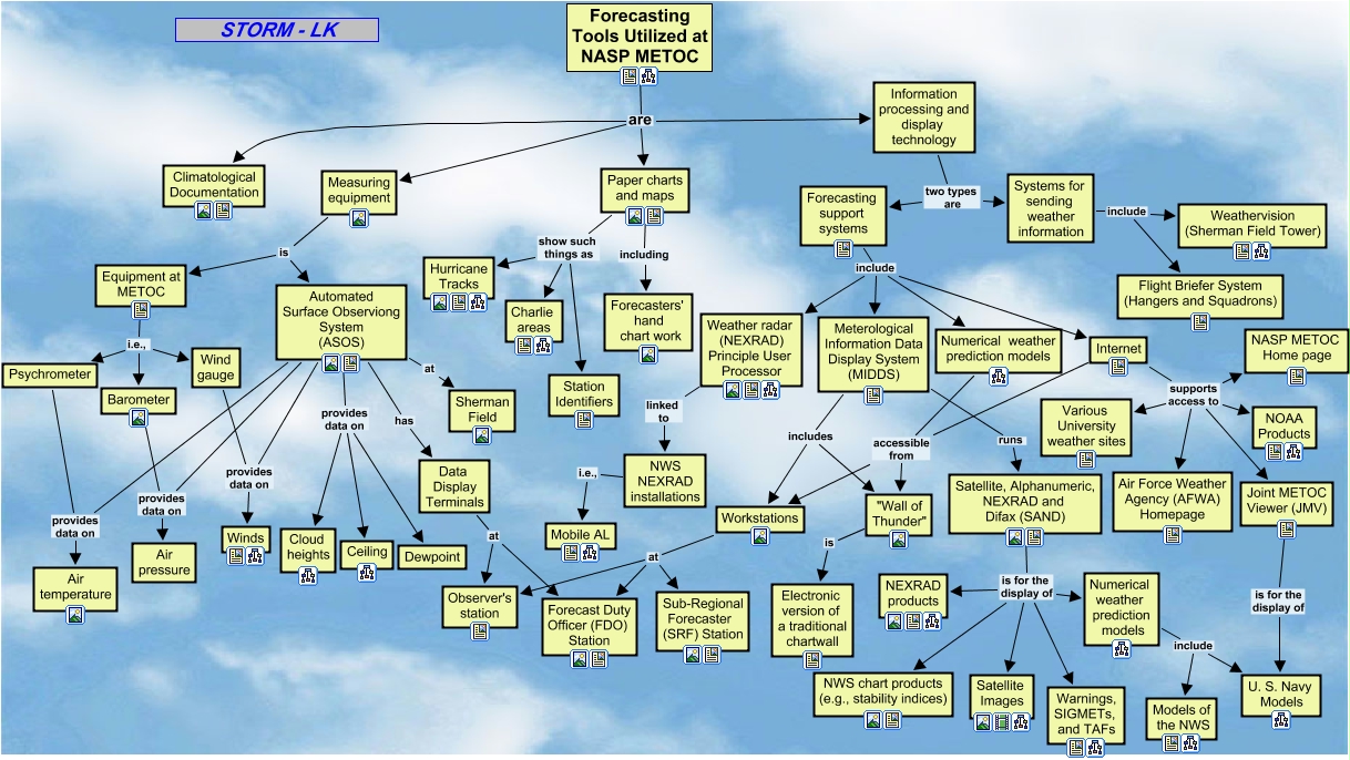 This Concept Map, created with IHMC CmapTools, has information related to: Forecasting Tools, Meterological Information Data Display System (MIDDS) includes Workstations, Forecasting support systems include Meterological Information Data Display System (MIDDS), Forecasting support systems include Internet, Meterological Information Data Display System (MIDDS) includes "Wall of Thunder", Equipment at METOC i.e., Barometer, Paper charts and maps including Forecasters' hand chart work, Equipment at METOC i.e., Wind gauge, Data Display Terminals at Observer's station, Meterological Information Data Display System (MIDDS) runs Satellite, Alphanumeric, NEXRAD and Difax (SAND), Workstations at Sub-Regional Forecaster (SRF) Station, Weather radar (NEXRAD) Principle User Processor linked to NWS NEXRAD installations, Measuring equipment is Automated Surface Observiong System (ASOS), Automated Surface Observiong System (ASOS) provides data on Ceiling, Workstations at Observer's station, Satellite, Alphanumeric, NEXRAD and Difax (SAND) is for the display of NWS chart products (e.g., stability indices), Internet supports access to Joint METOC Viewer (JMV), Automated Surface Observiong System (ASOS) provides data on Winds, Wind gauge provides data on Winds, Forecasting Tools Utilized at NASP METOC are Information processing and display technology, Internet supports access to Various University weather sites